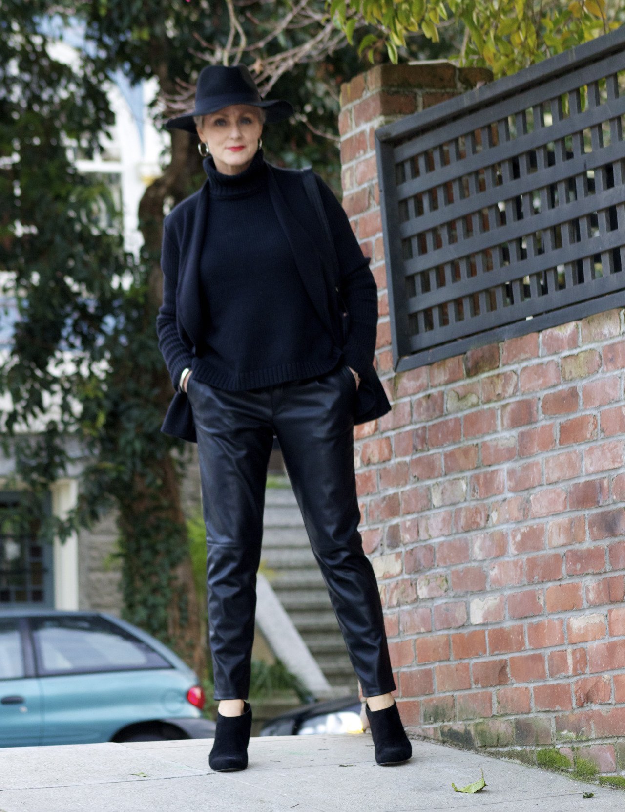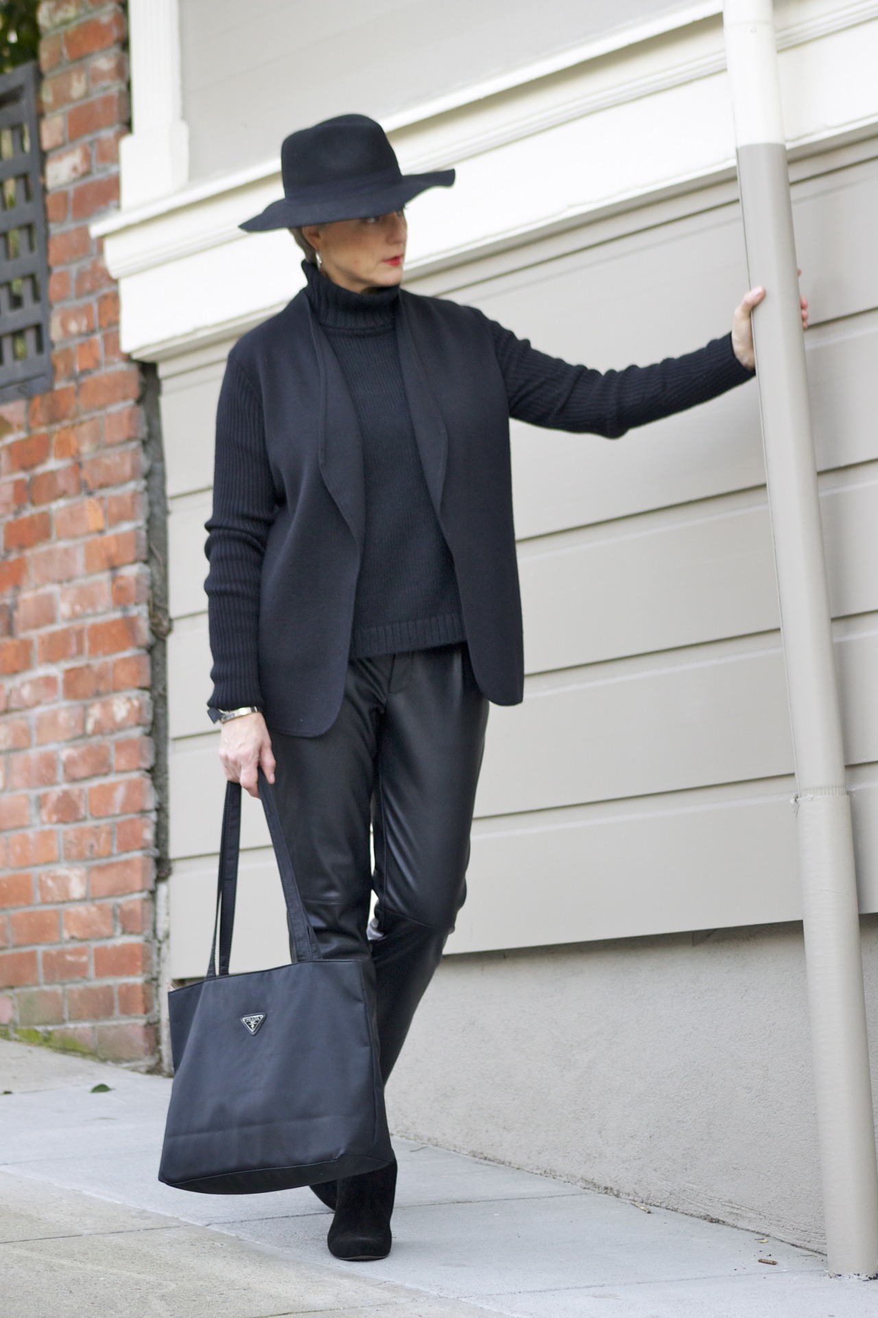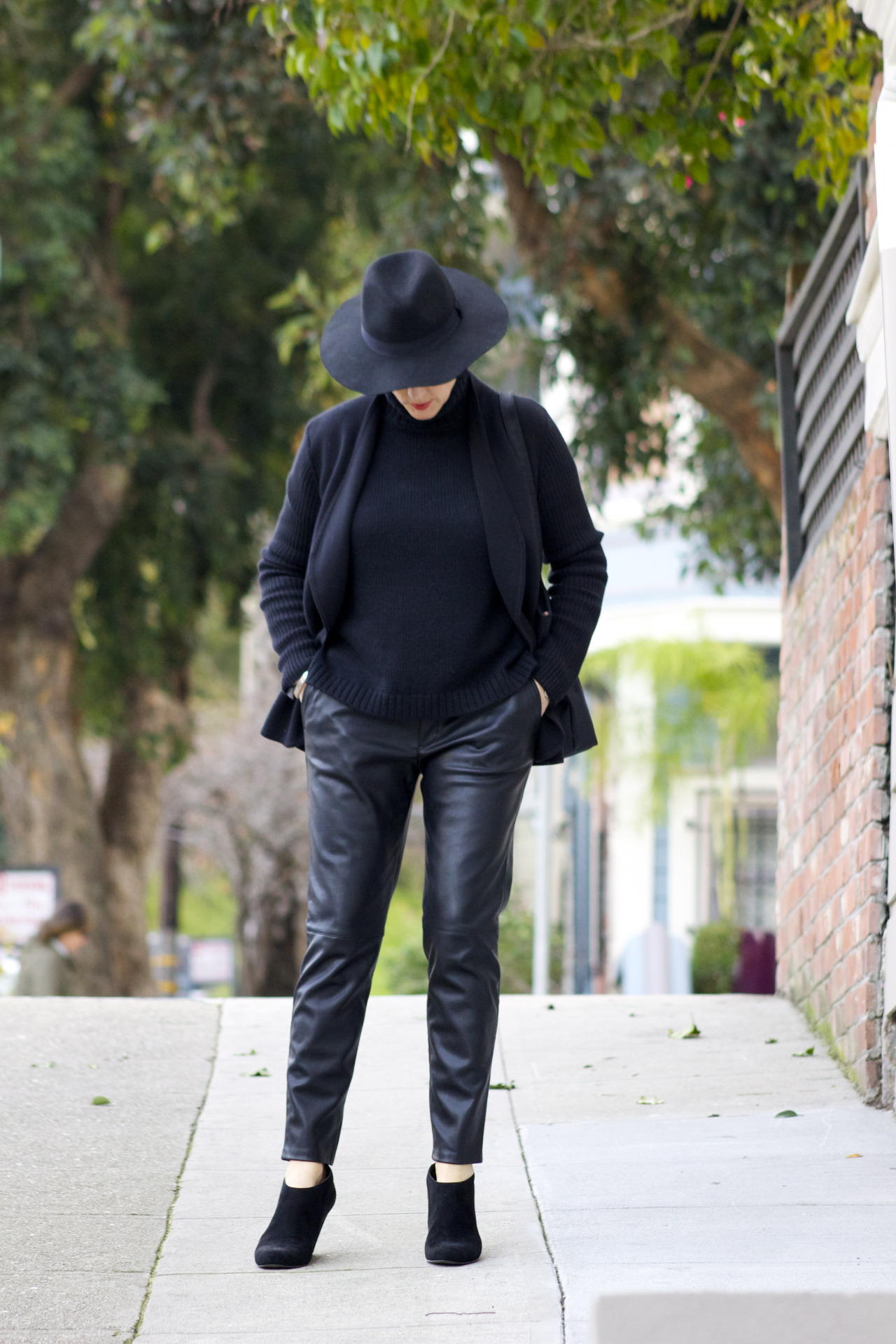 faux leather trousers @Zara; sweater @OldNavy; cardigan @BananaRepublic; booties @Ninewest
