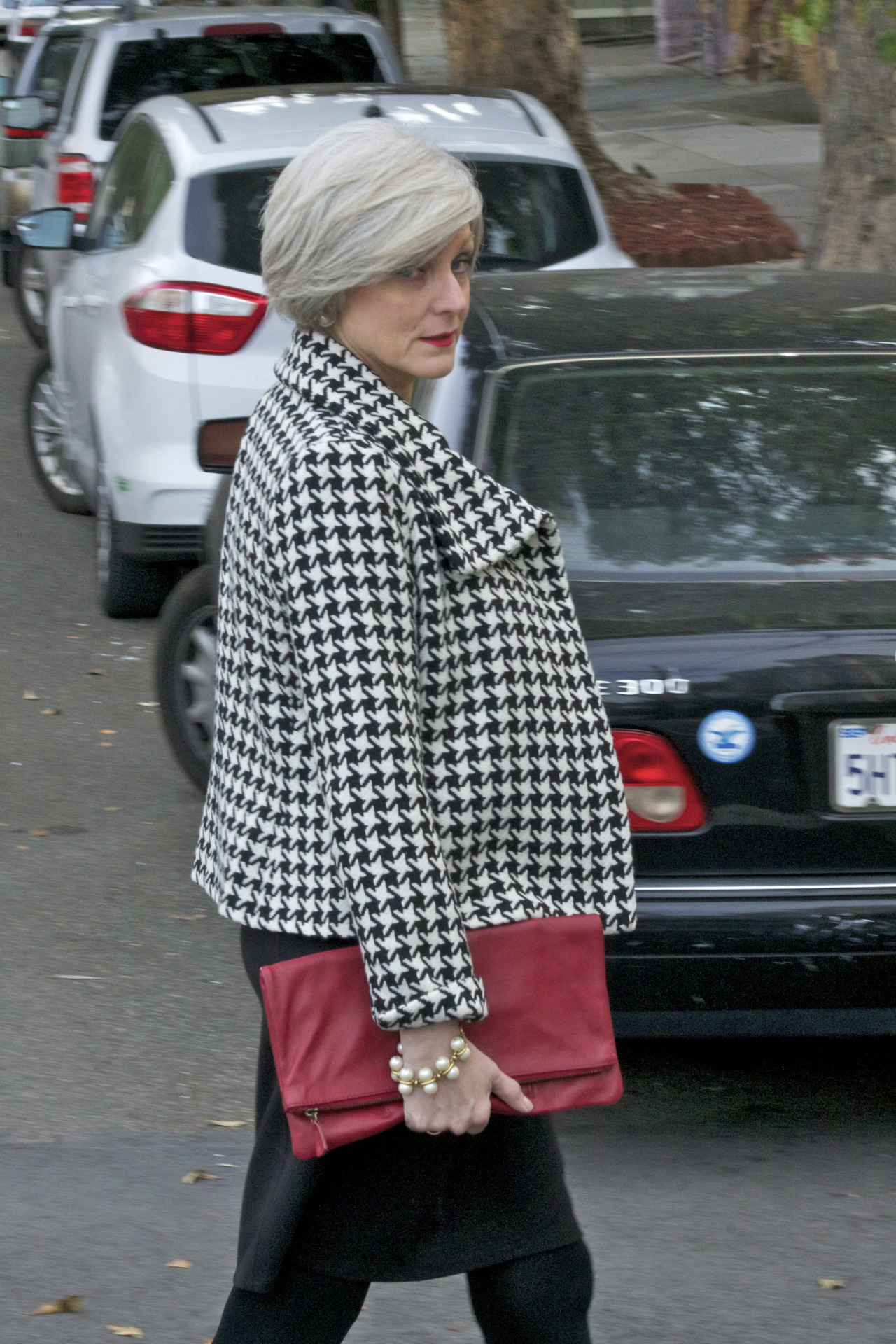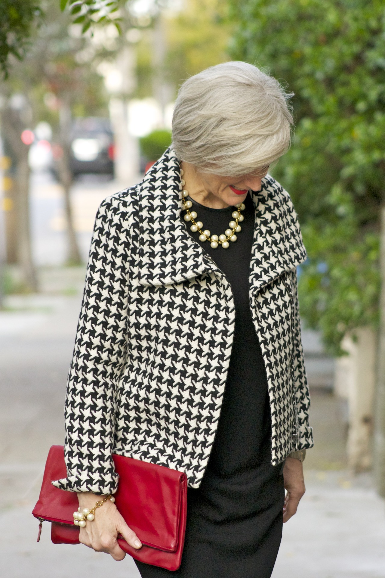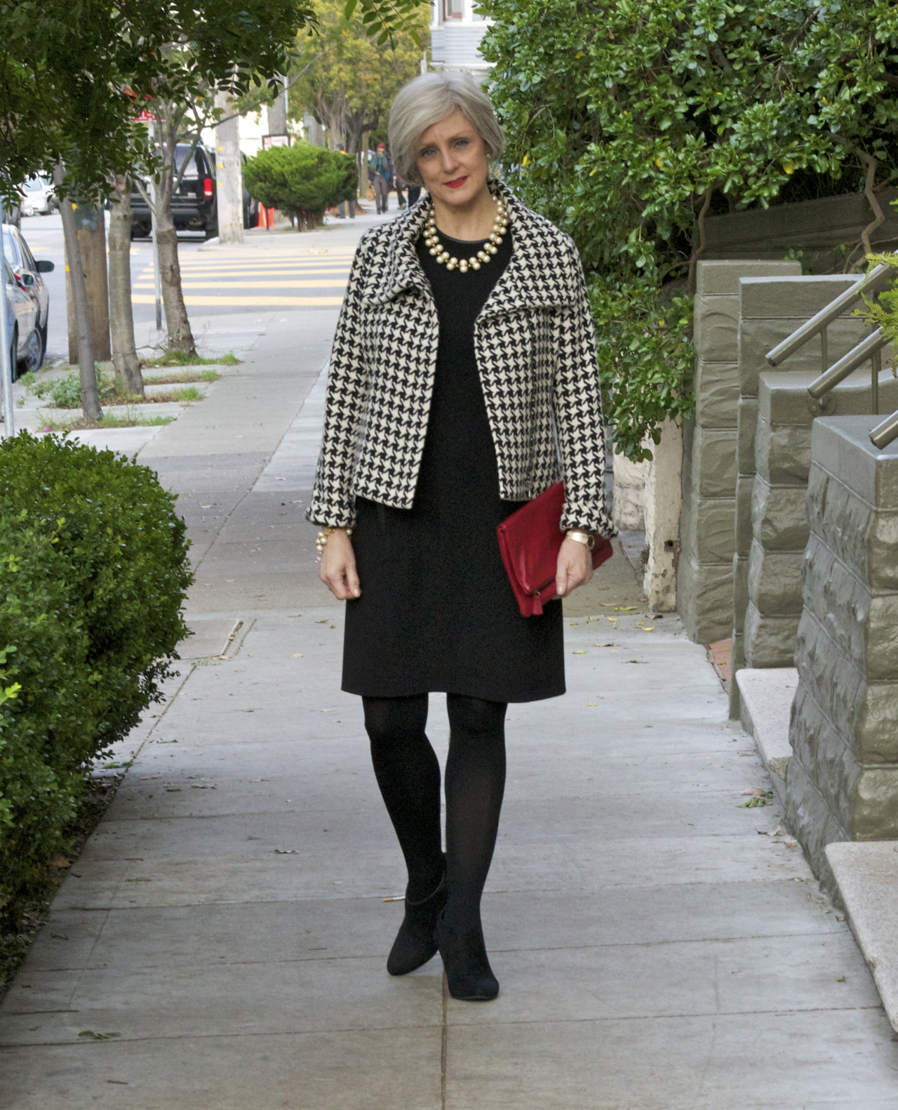dress @RalphLauren; blazer @Talbots; booties @NineWest; handbag @MarkandGraham; necklace jcrew