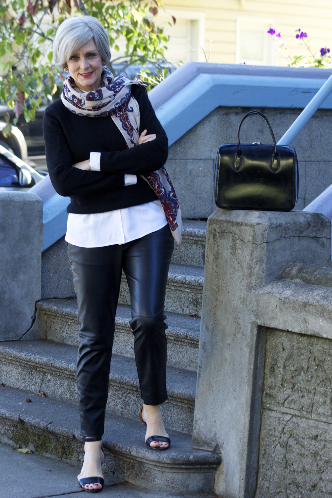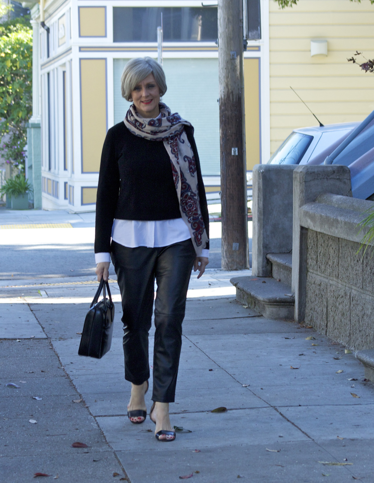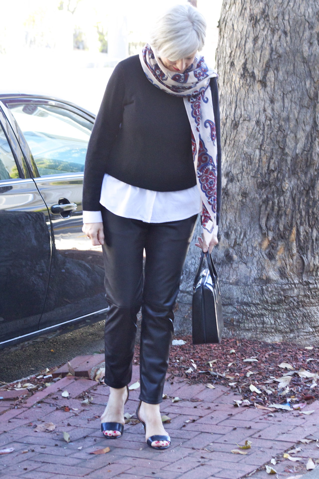 faux leather trousers @zara; shirt @BananaRepublic; sweater @BananaRepublic; sandals @Ninewest; scarf @JCrew; handbag prada