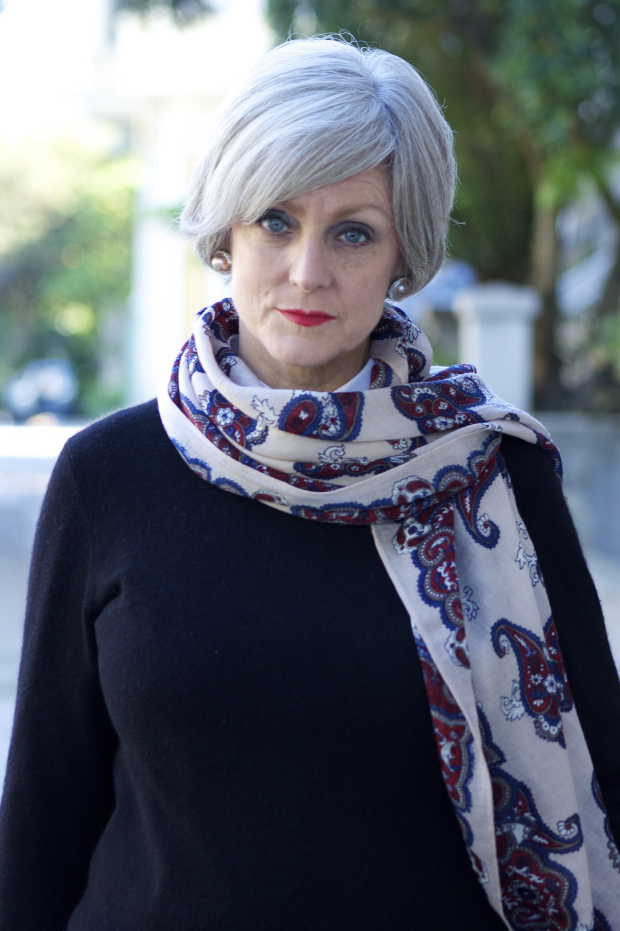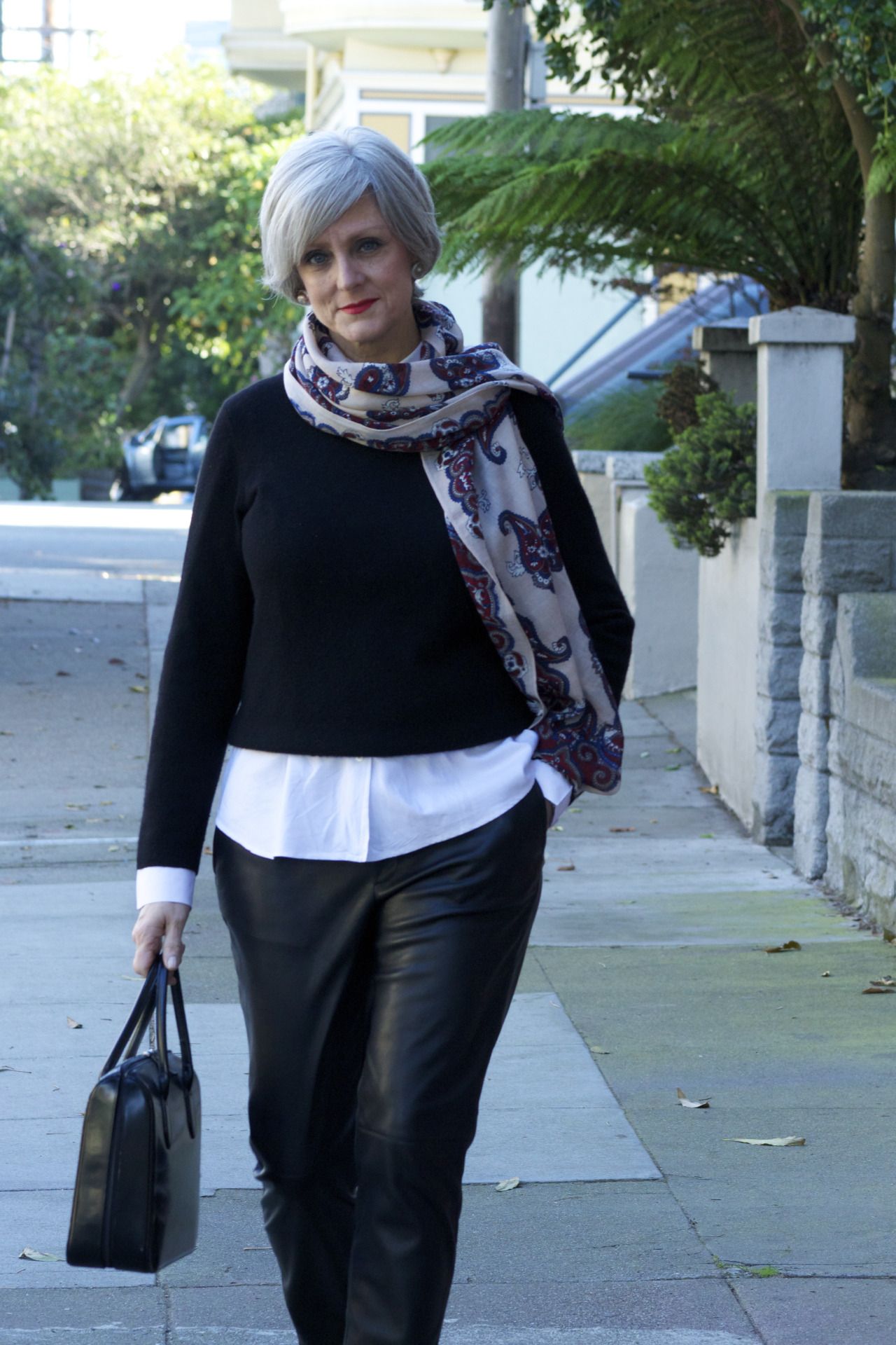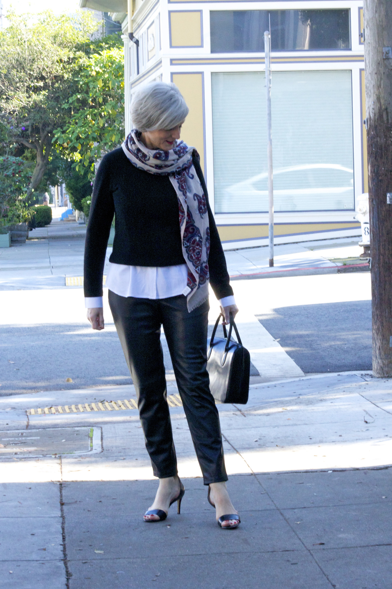 faux leather trousers @zara; shirt @BananaRepublic; sweater @BananaRepublic; sandals @Ninewest; scarf @JCrew; handbag prada