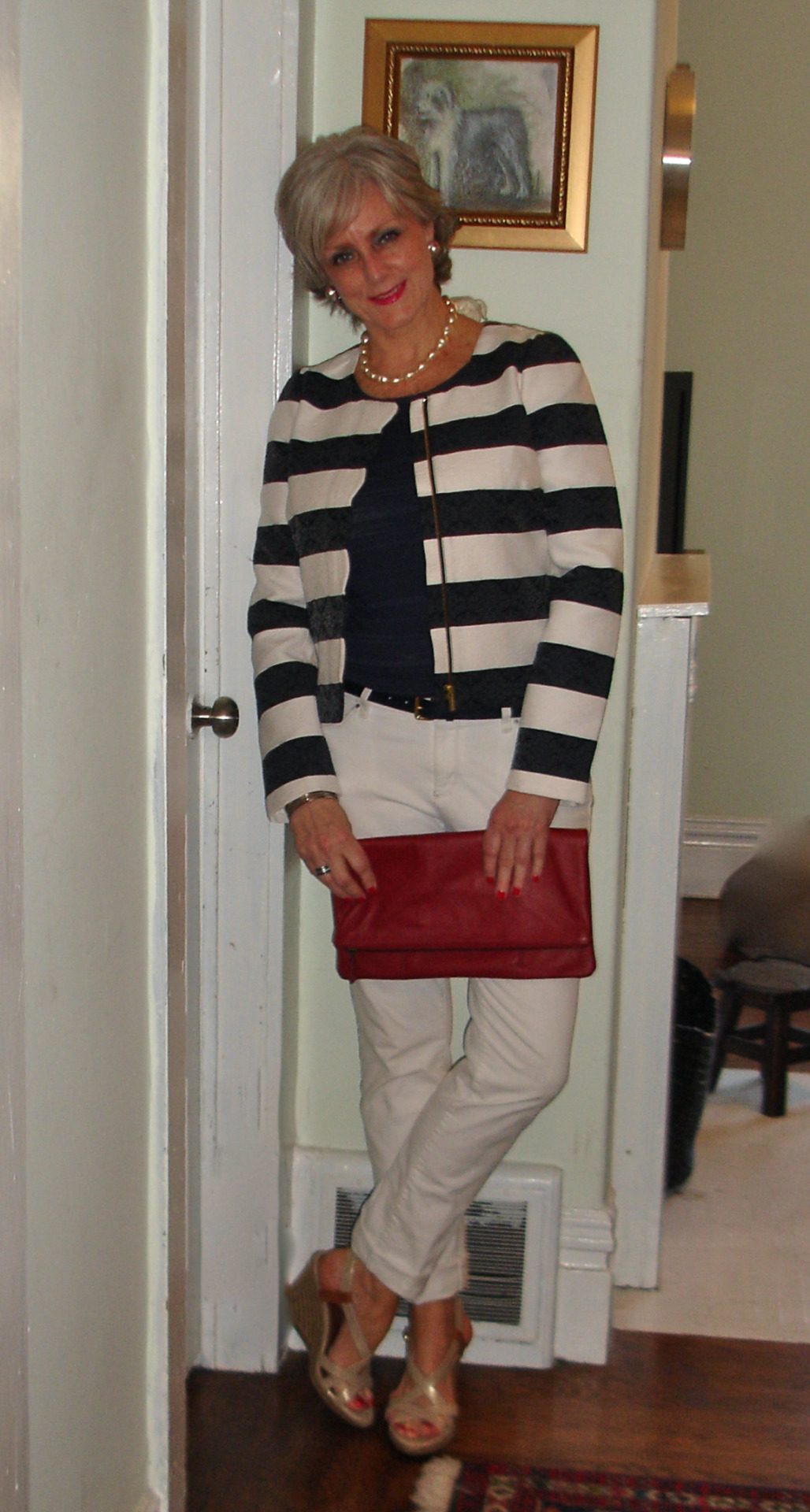 Outfit post – Blazer by Banana Republic; T-shirt by Banana Republic; Denim by Ann Taylor; Belt by jcrew; Espadrilles by Banana Republic; Leather clutch by Mark and Graham
