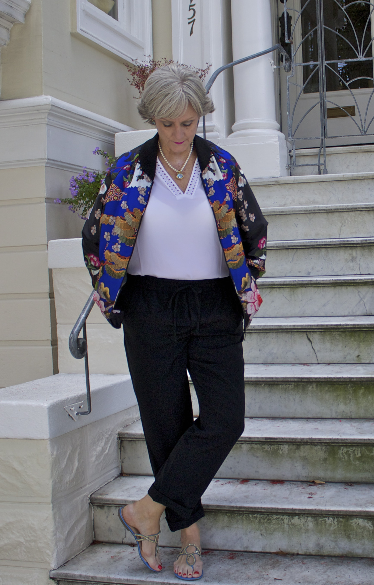 <outfit post> brunch: pants by Banana Republic; shirt by Banana Republic; jacket by Zara; sandals by Talbots