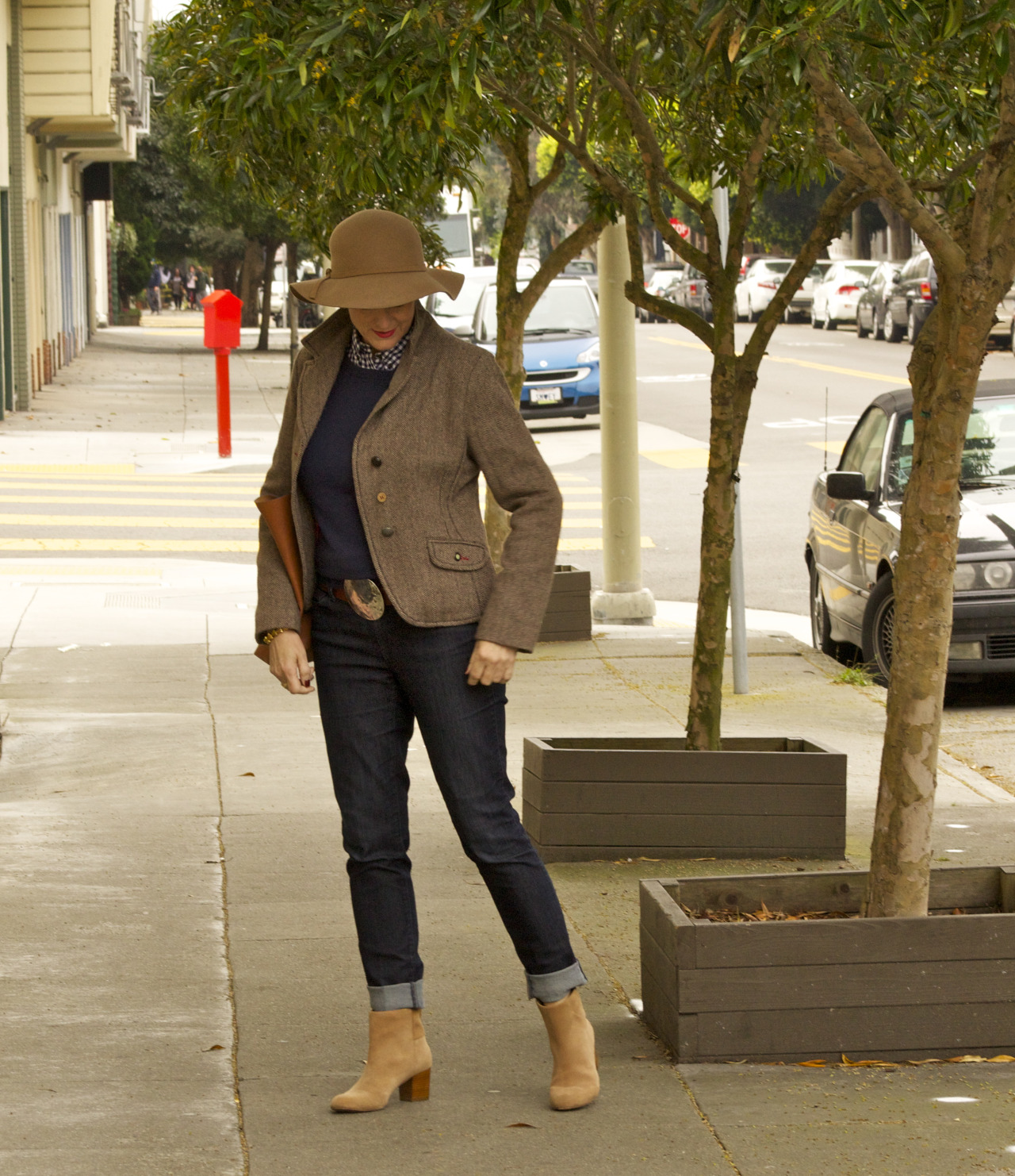 denim by Ann Taylor; sweater by Banana Republic; shirt by Gap; blazer by ActiveWear; booties by Banana Republic; tote by Madewell