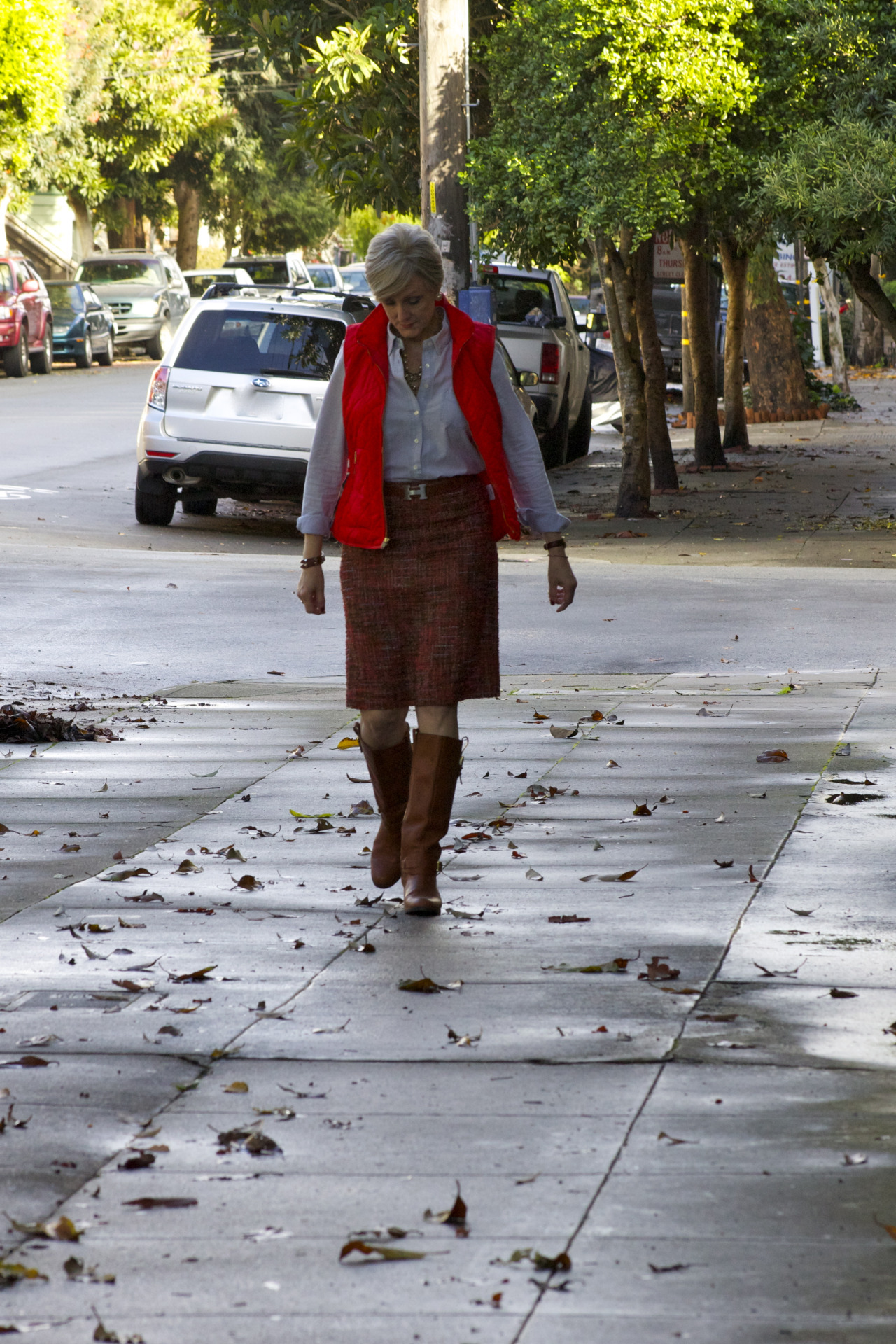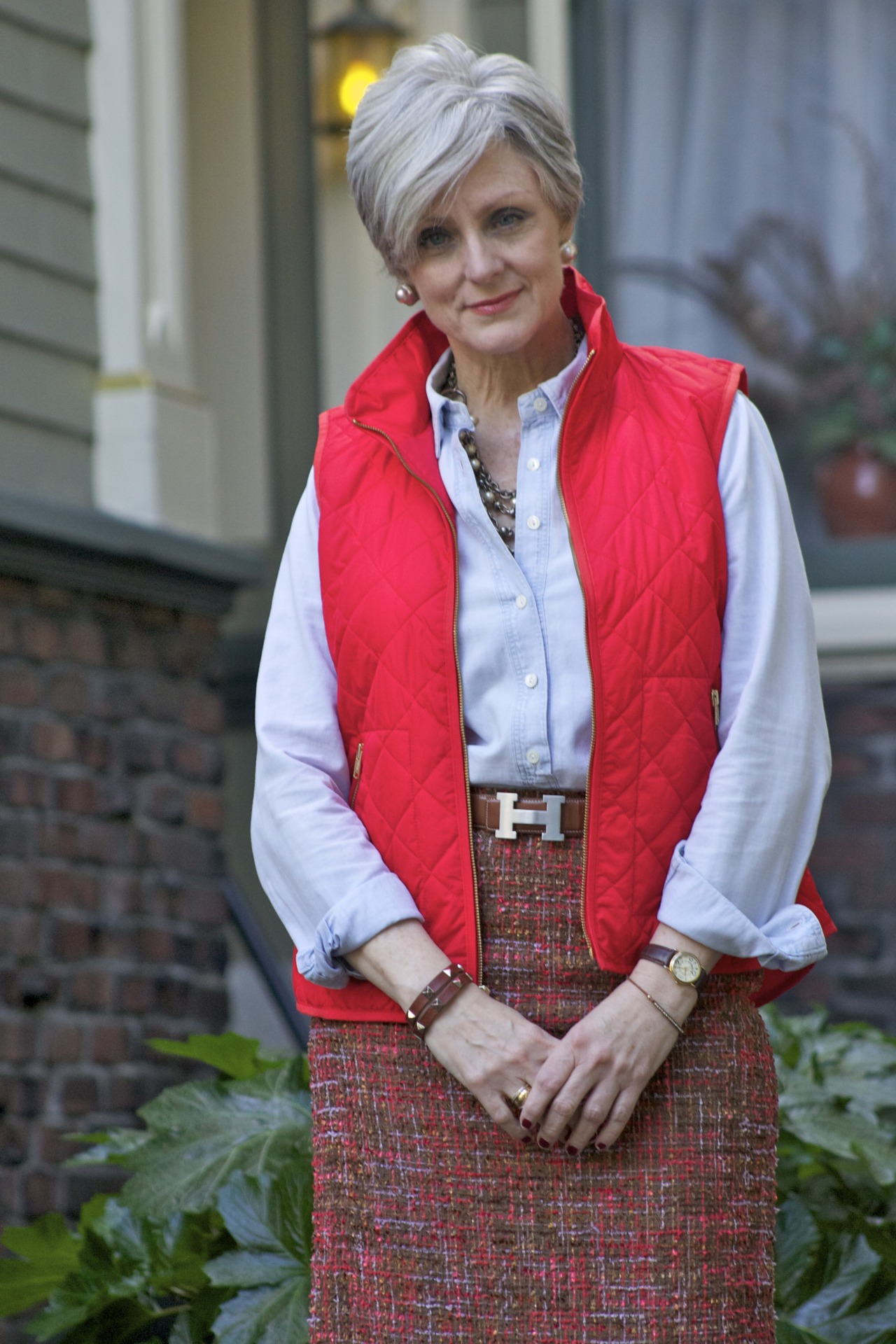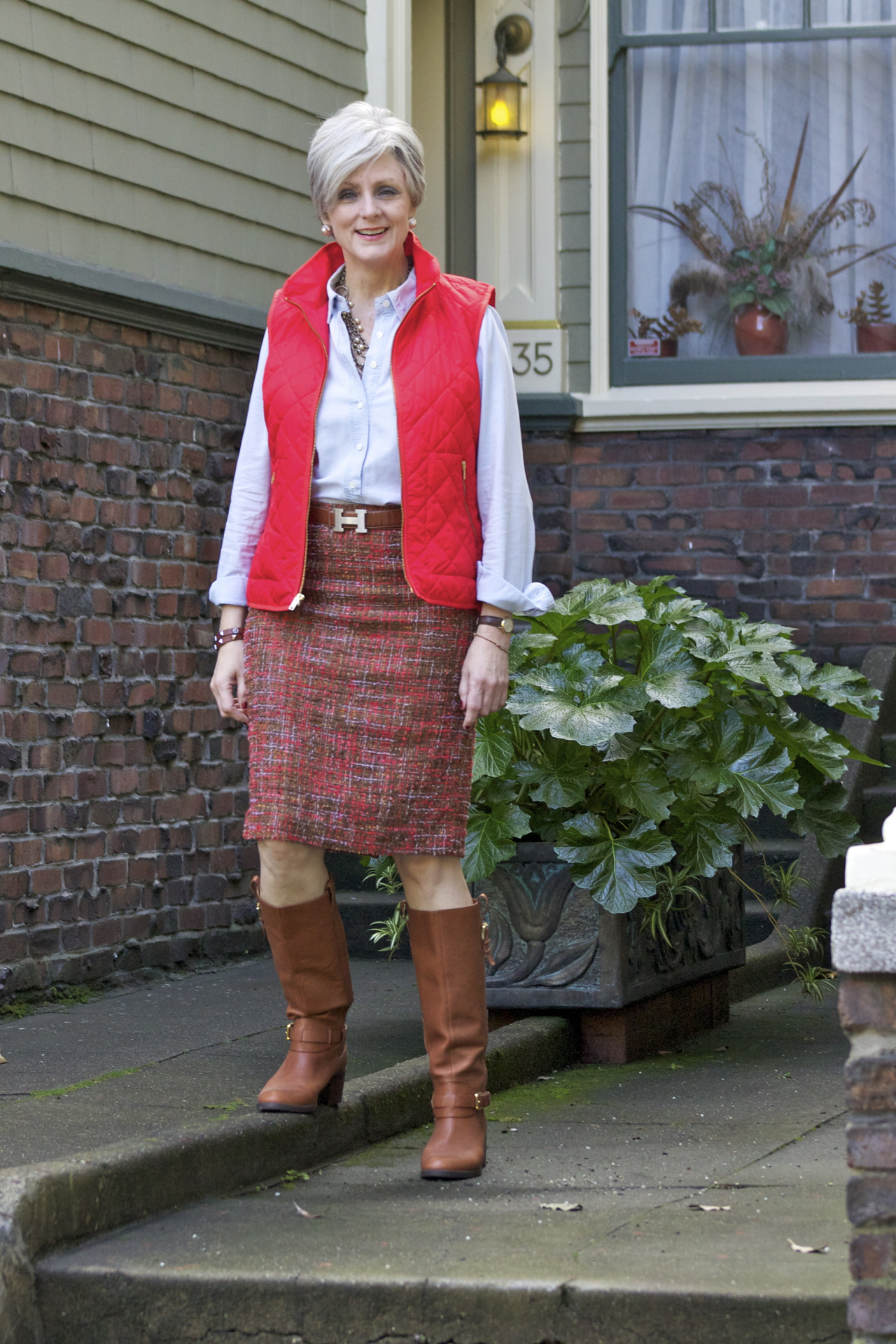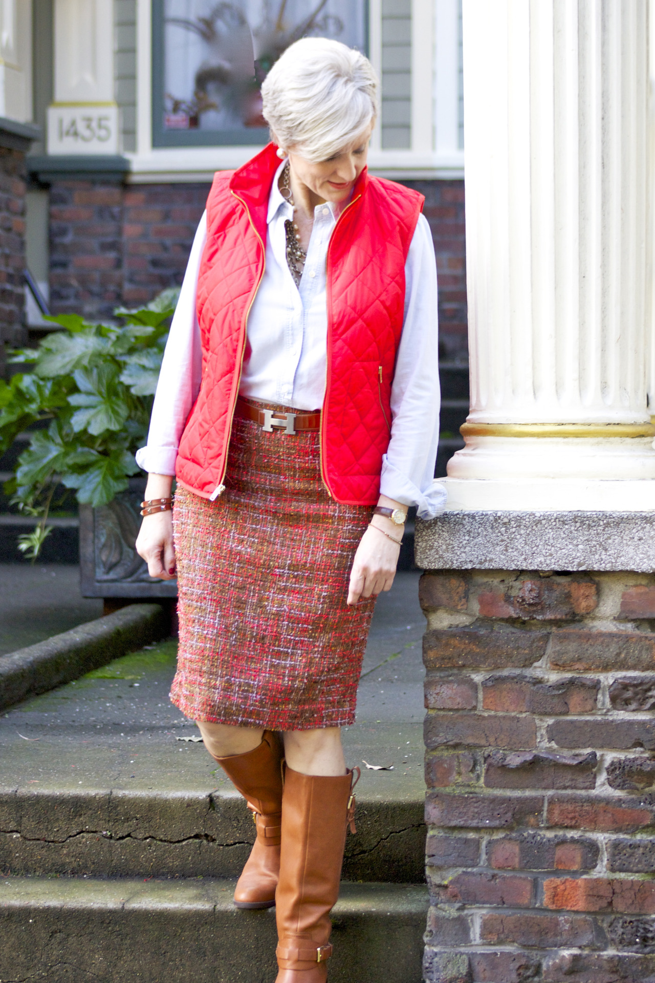 skirt & shirt @JCrew; puffer vest @OldNavy; boots @RalphLauren; belt @Hermes