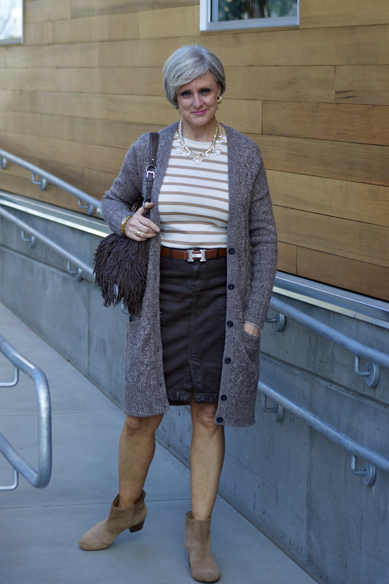 skirt @BananaRepublic; tee @AnnTaylor; cardigan sweater @AnnTaylor; belt @Hermes; boots @BananaRepublic; necklace @BananaRepublic; handbag @Prada