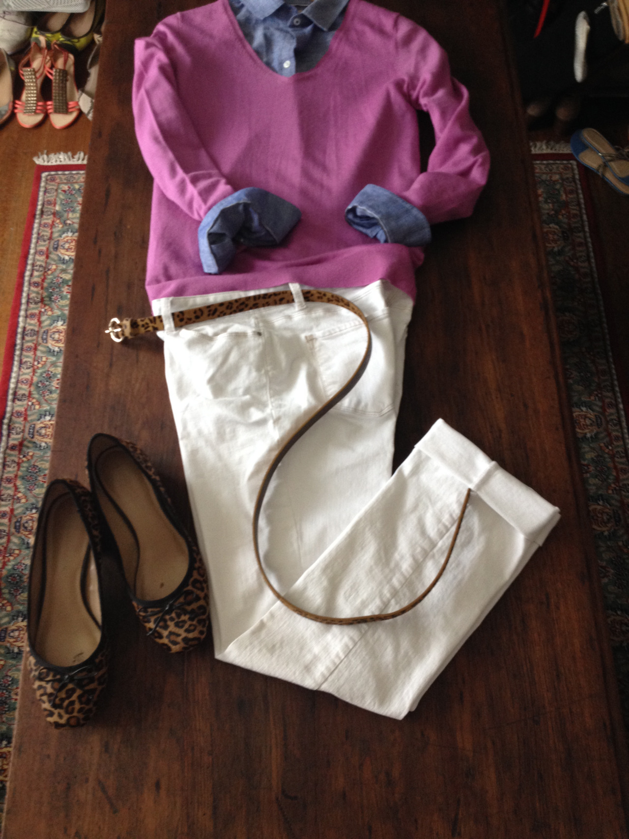 denim by Ann Taylor; shirt by Banana Republic; Sweater by JCrew; shoes by Banana Republic; belt by Banana Republic