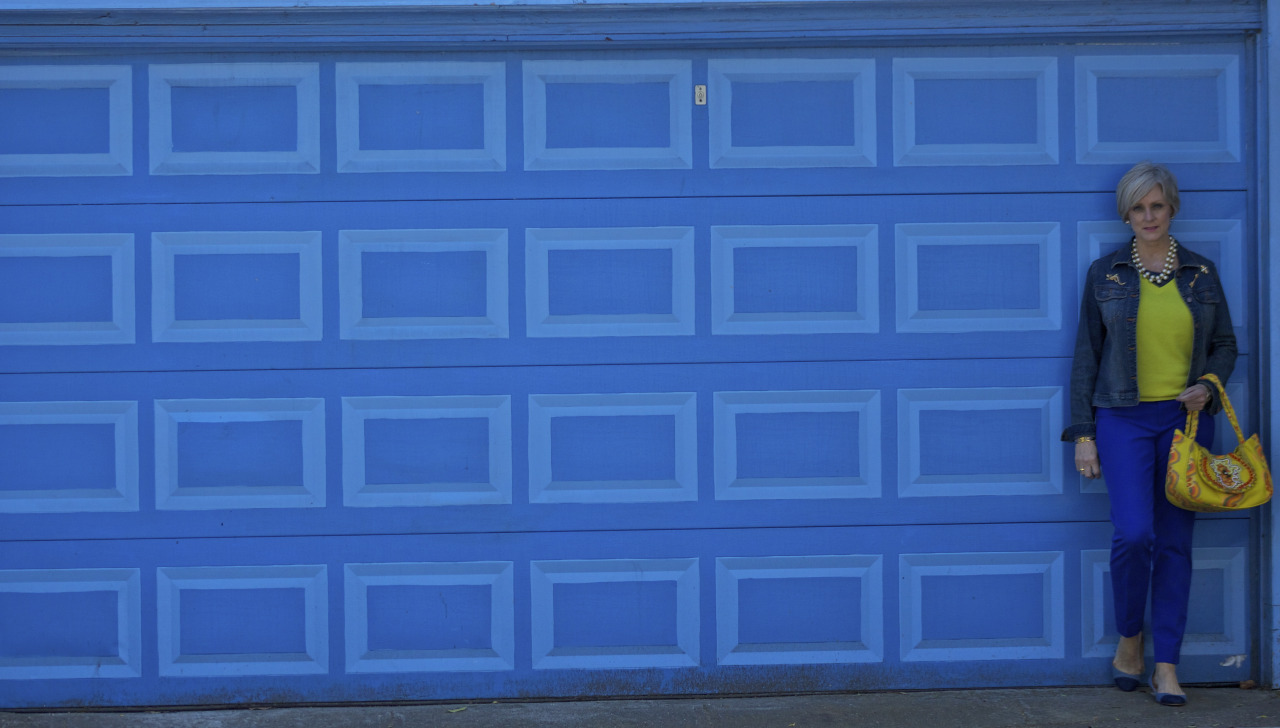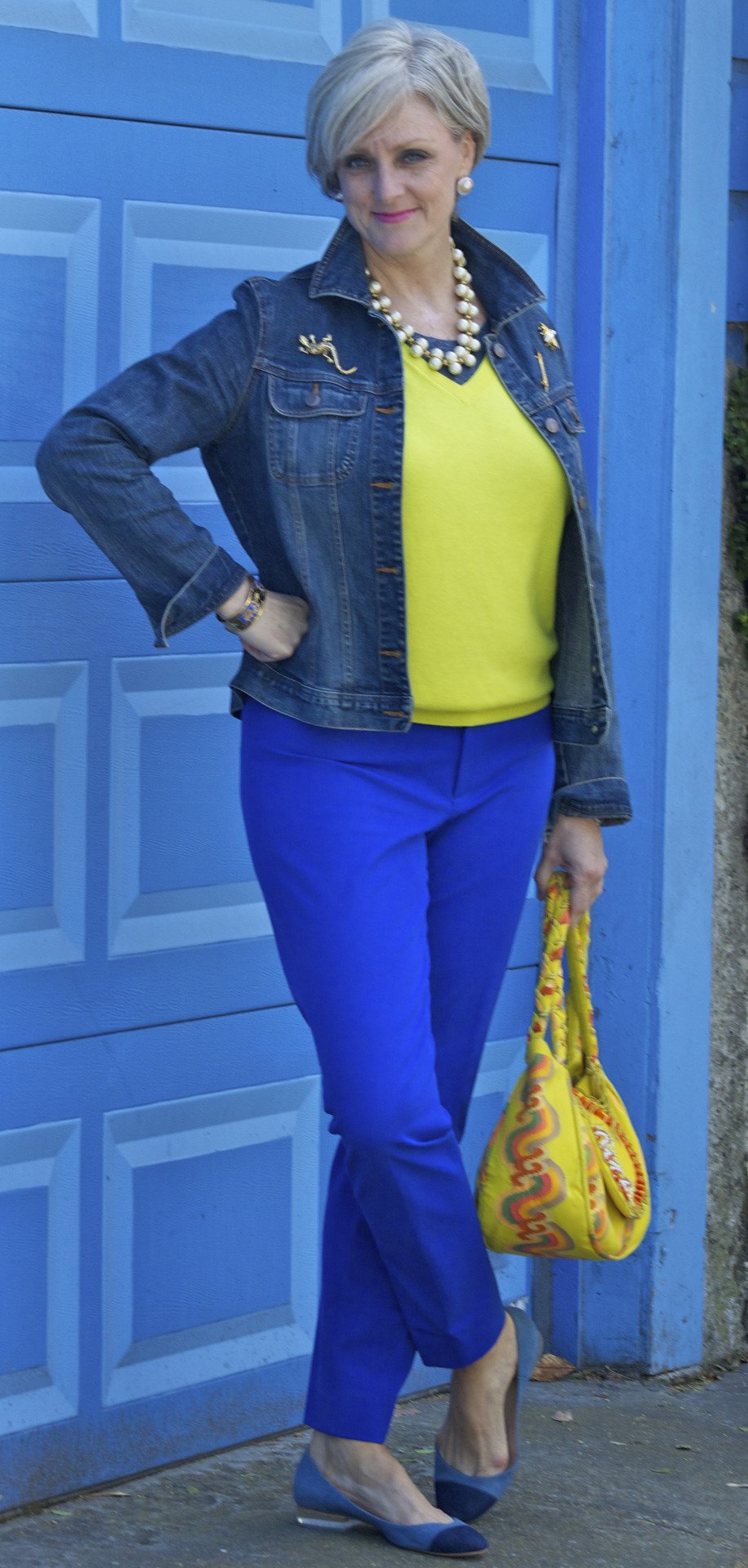 if there is one thing that brightens my mood it’s color. i love it and try to mix it into my wardrobe as often as possible. to be certain, there is nothing more sophisticated than gray, black or navy. but if you are going for a bold, spirited look try kelly green, shocking pink, or orange. today, i pumped up the energy with my ensemble with cobalt blue and neon yellow. to keep the outfit from going over the top, i softened the look with denim flats and denim jacket. i have had the jean jacket hanging in my closet for over fifteen years, and i never tire of it. to personalize the jacket add a few of your favorite pins or if simplicity is more to your liking leave them off. the fact of the matter is style it your way – have fun.