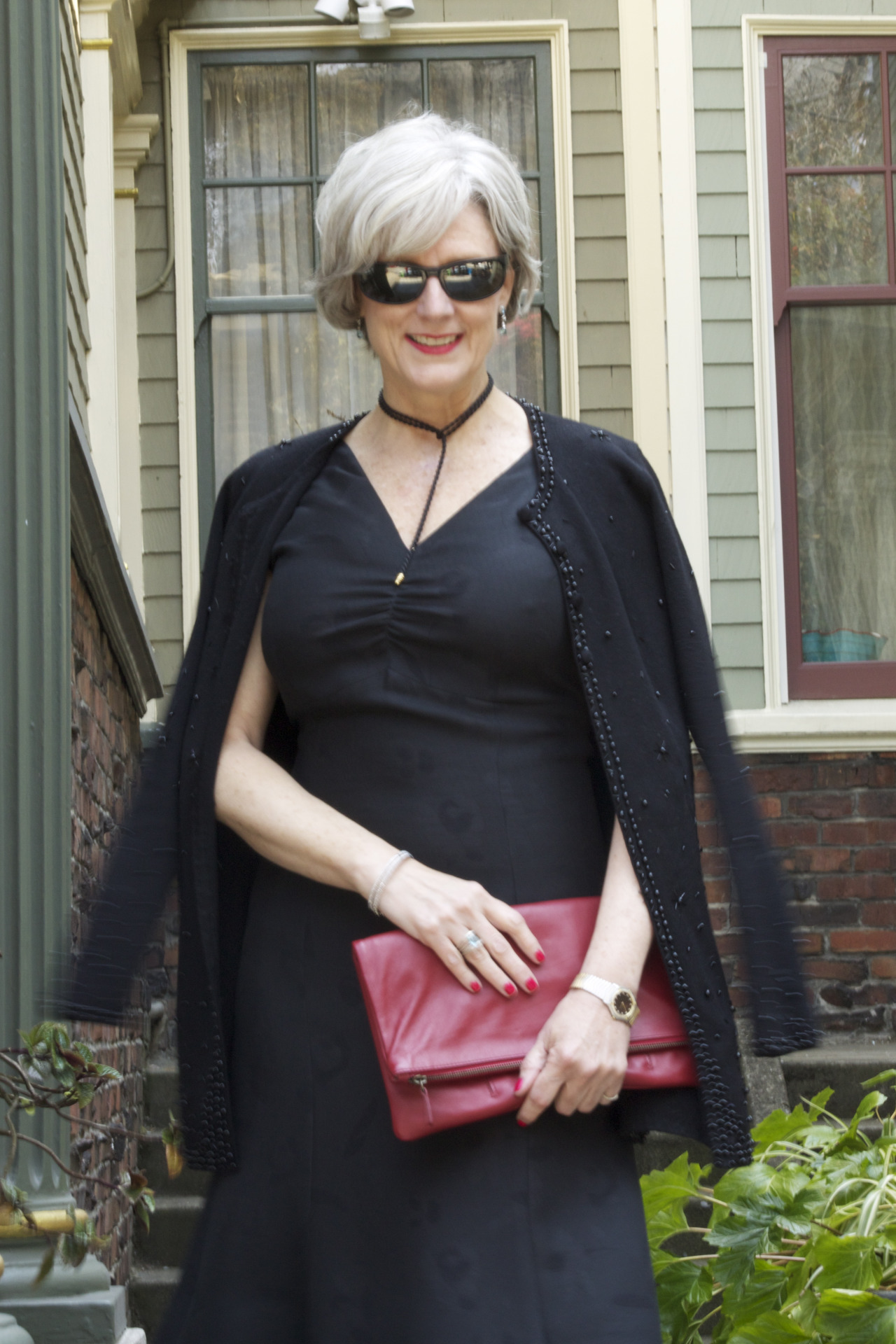dress armani; sweater Anne Klein; handbag Mark and Graham; shoes Enzo Angiolini