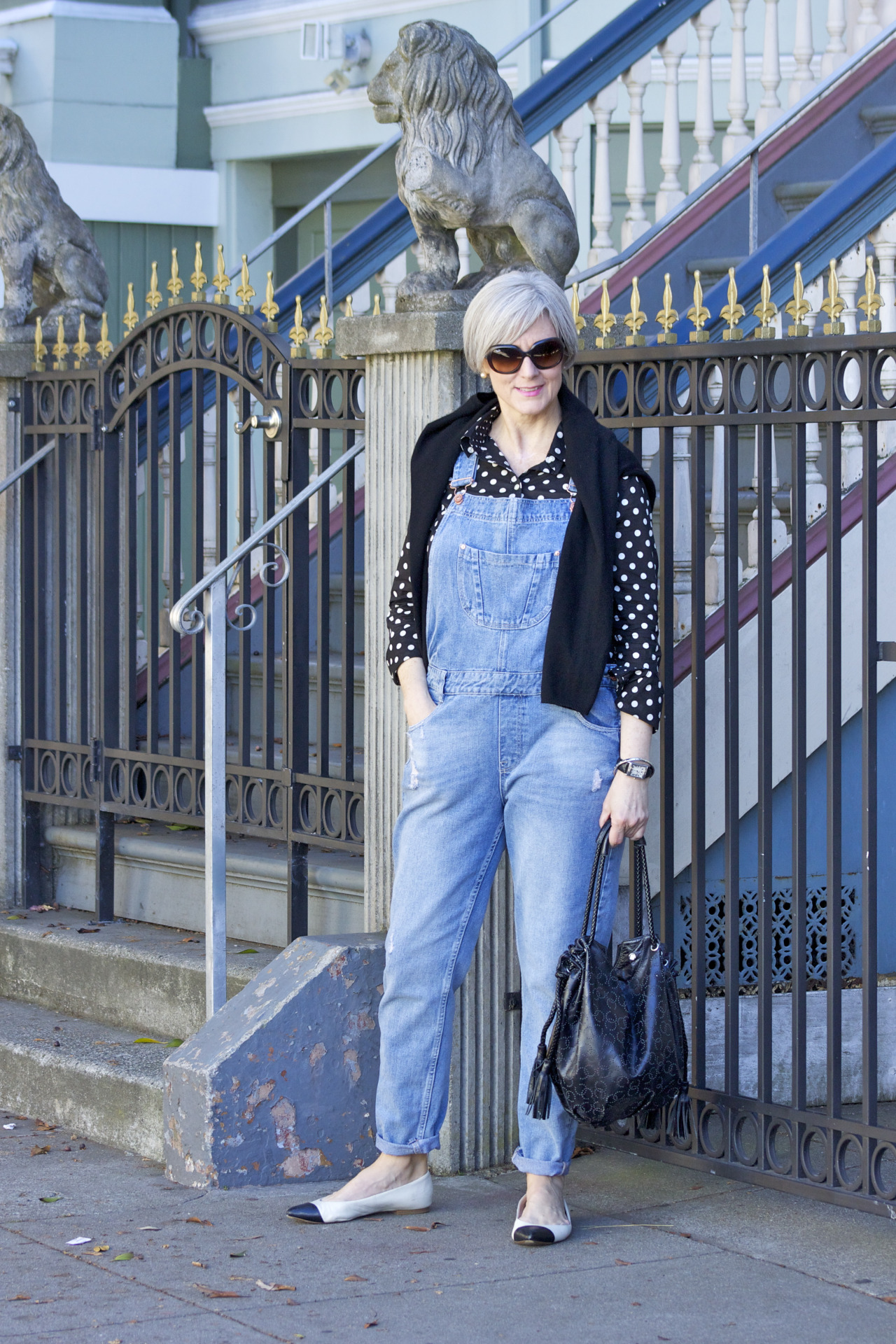overalls by Zara; shirt by Banana Republic; sweater by Old Navy; shoes by Banana Republic; handbag by Chanel; sunglasses by RayBan