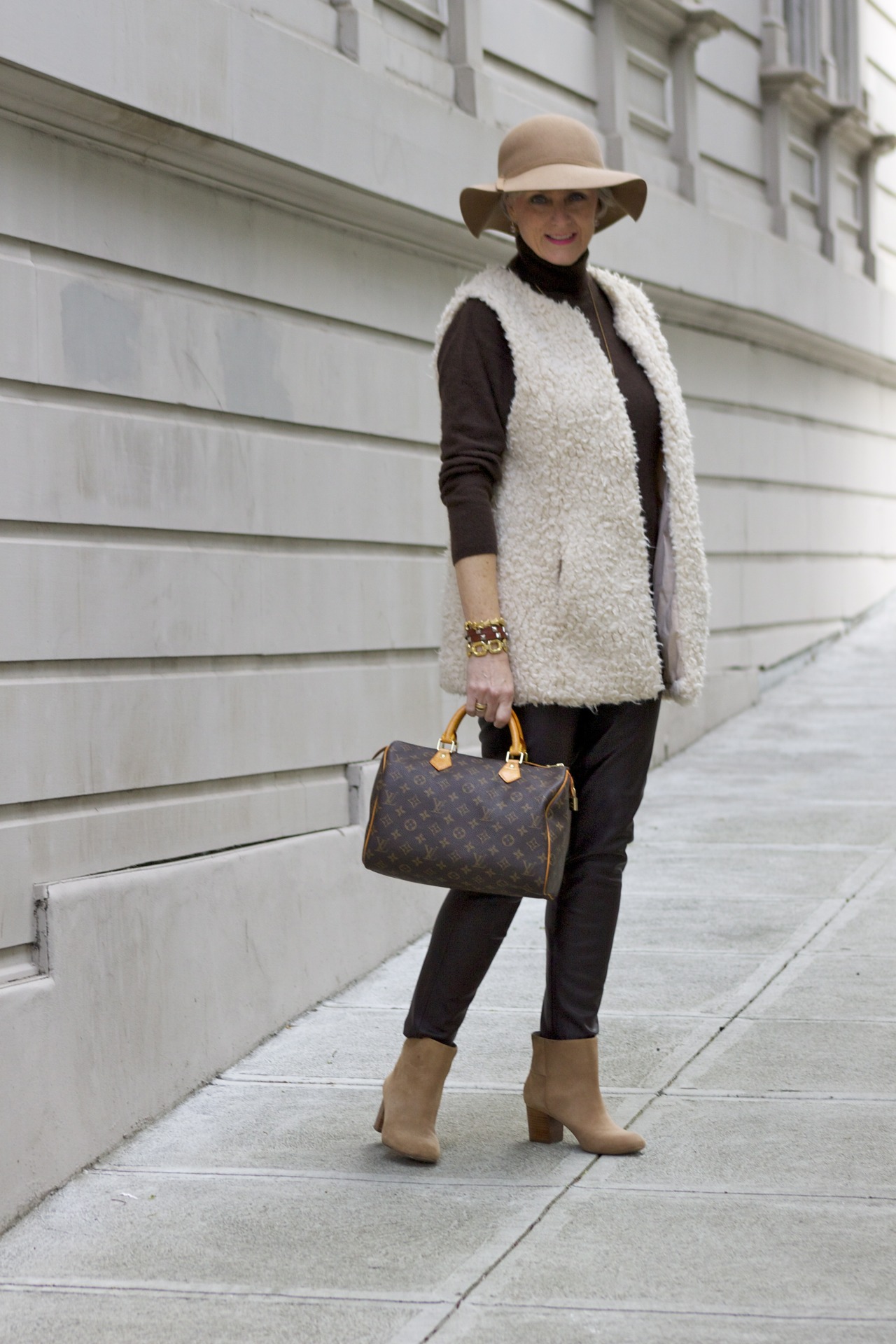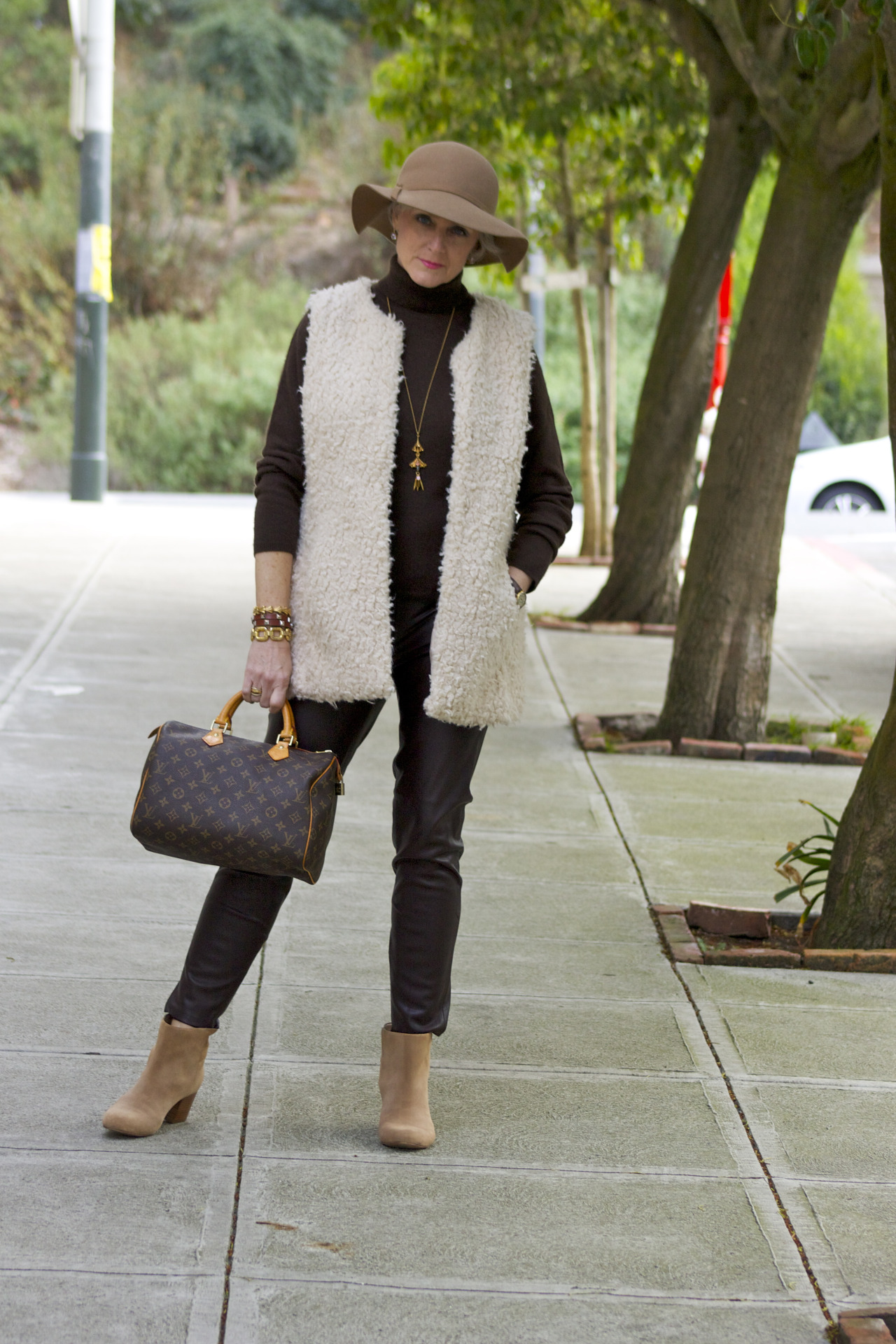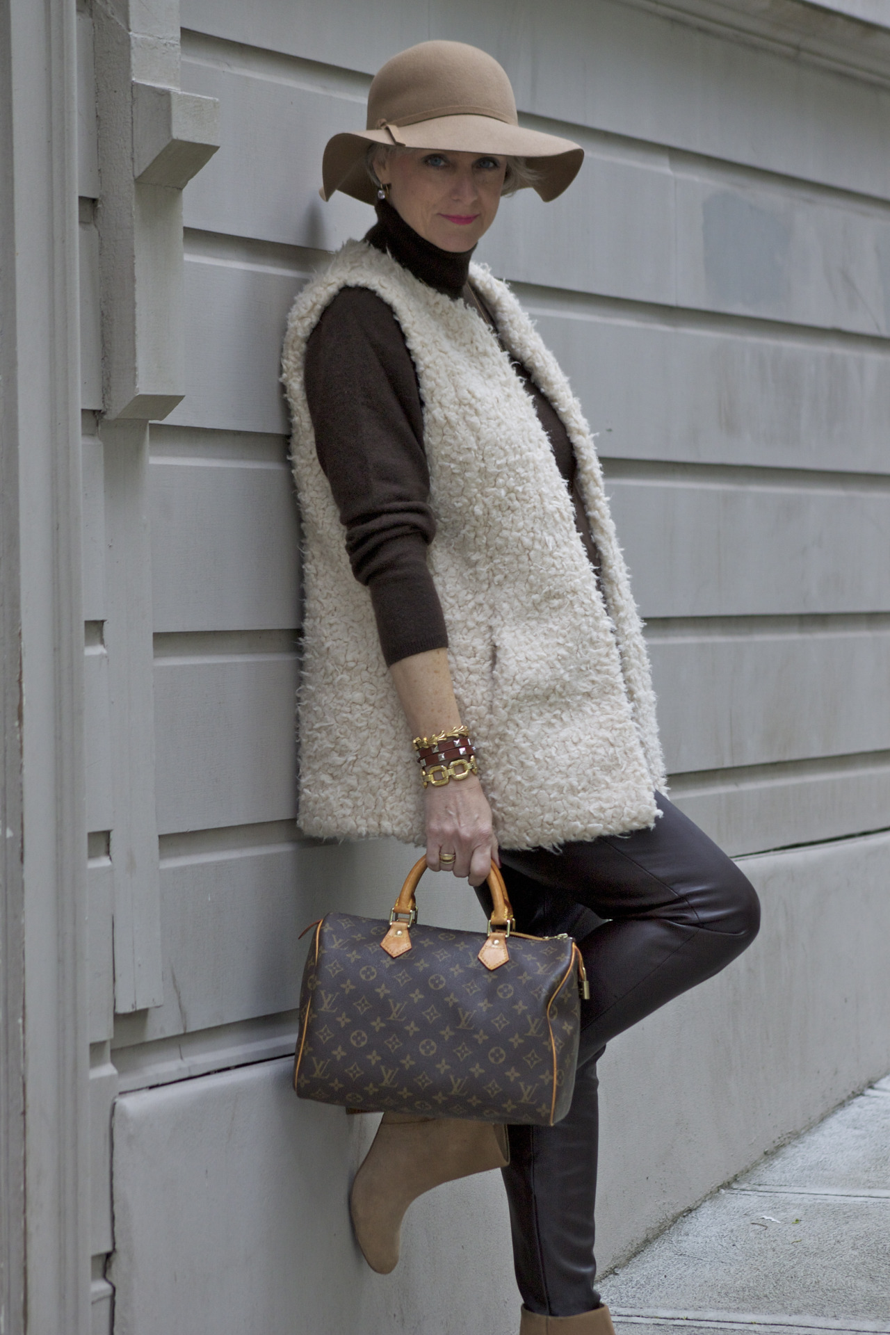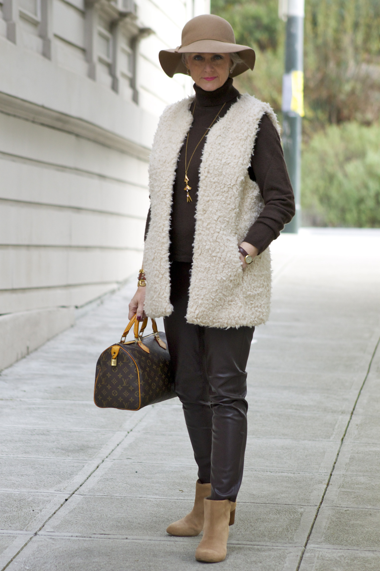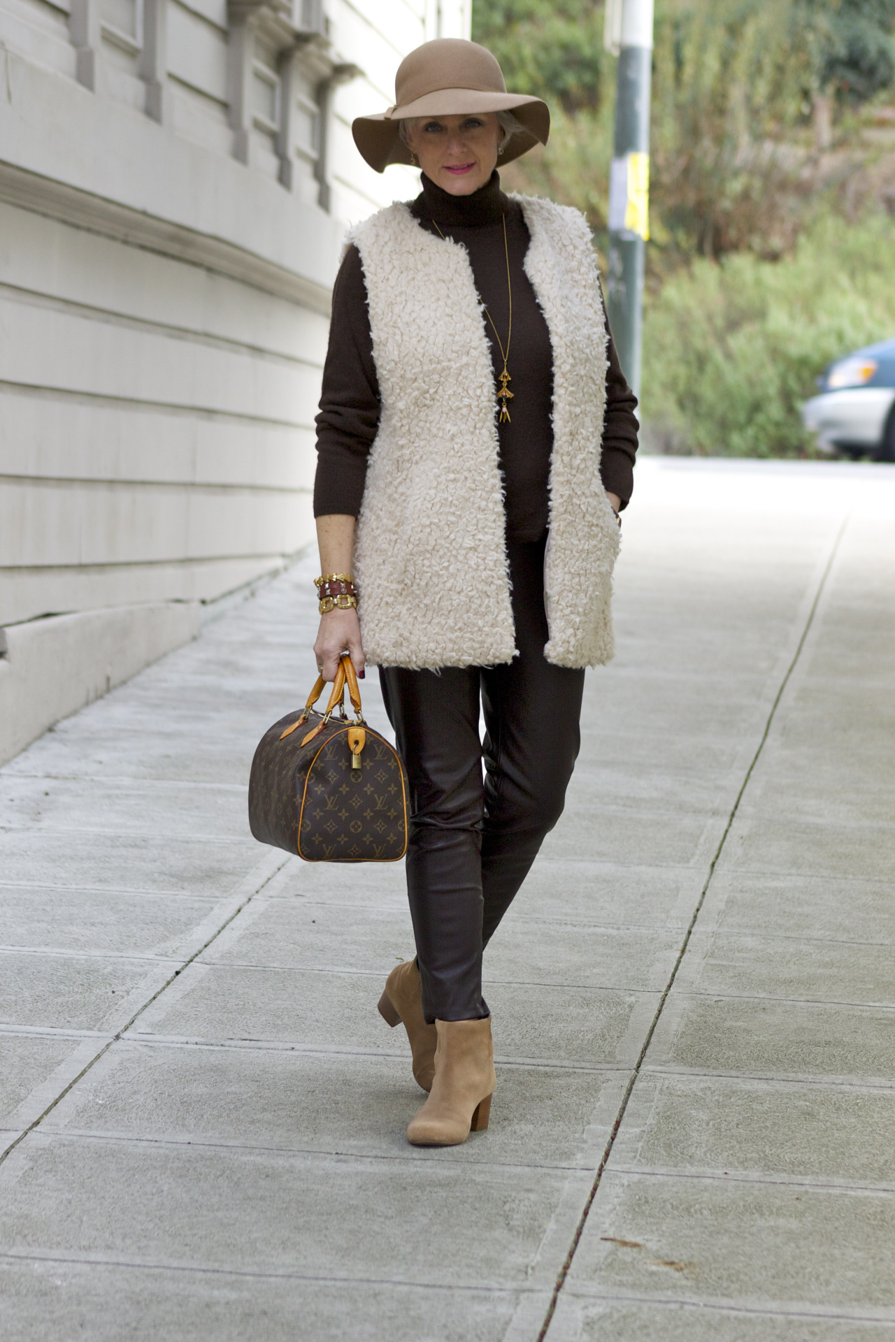 faux leather pants by Zara; sweater by Charter Club; vest by H&M; booties by Banana Republic; handbag by Louis Vuitton