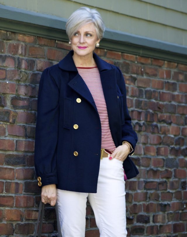 white jeans in the summer is a no-brainer, but white jeans during the winter months? that would be yes. white jeans is a look that i love all year round. for today’s ootd i went with a nautical look coordinating a striped sweater underneath a classic peacoat. I pulled out my tote from North 37 Design that is made from sailcloth (and practically indestructible) to keep the look fun and casual.