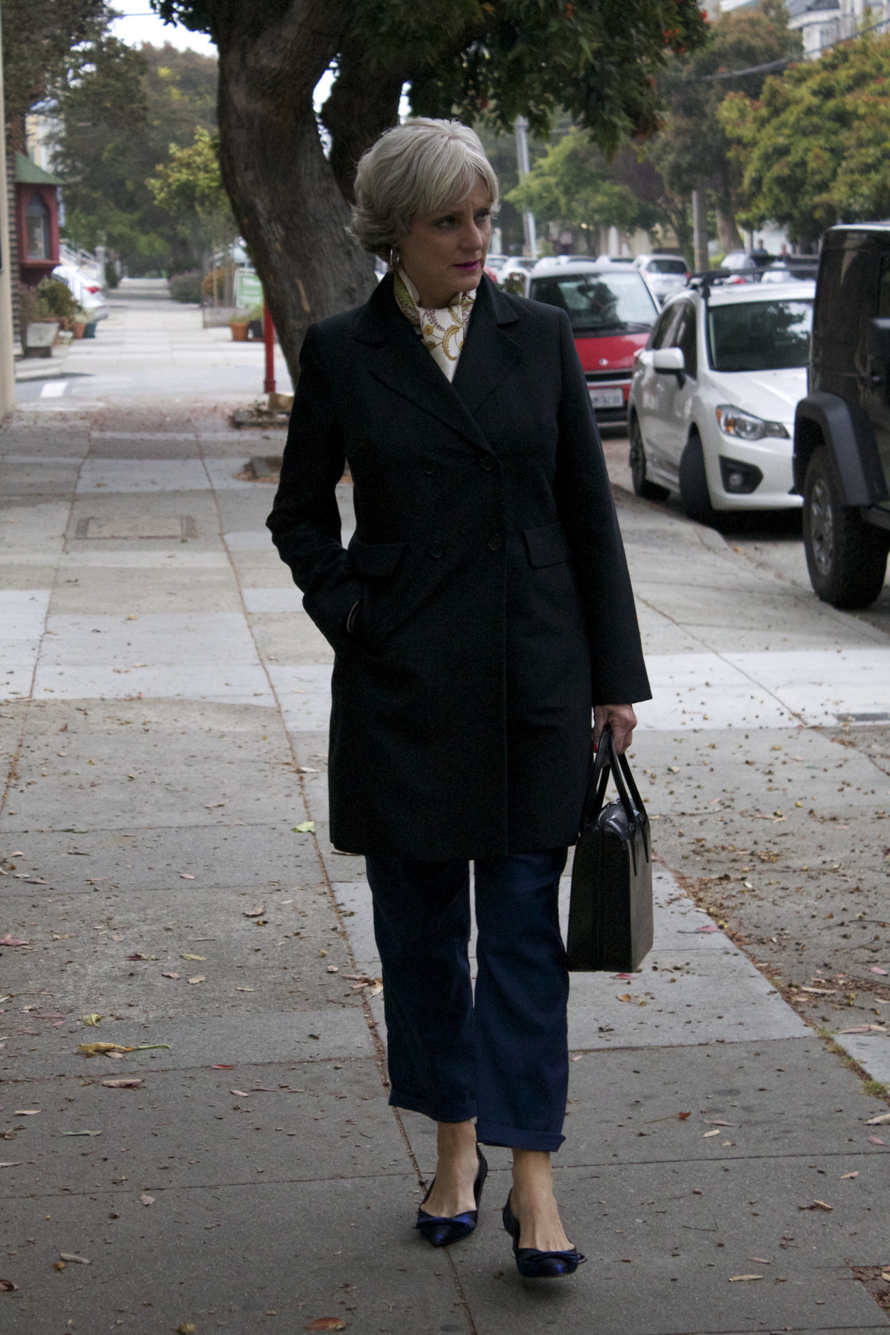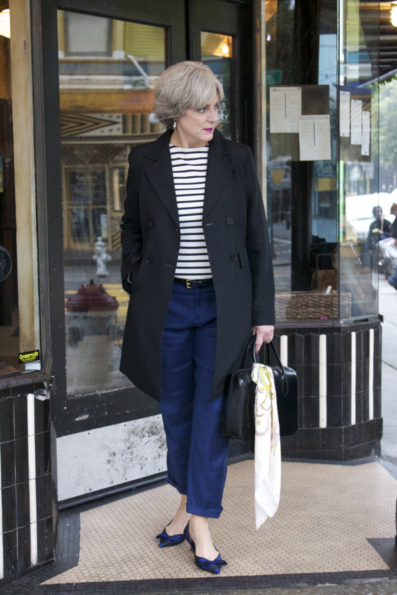 tee by Saint James @JCrew; pants by Banana Republic; shoes by Zara; trench by Talbots; scarf by Gucci; handbag by Prada
