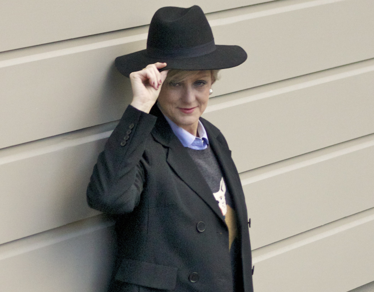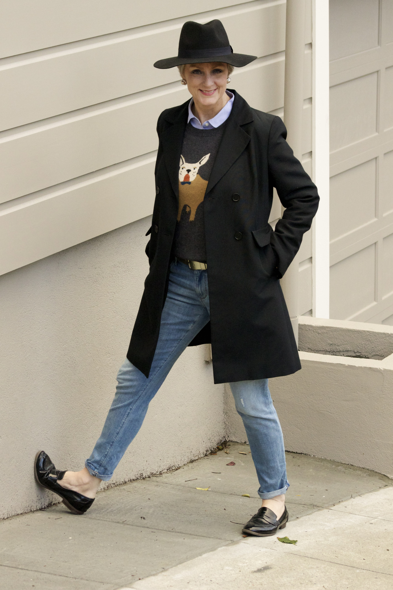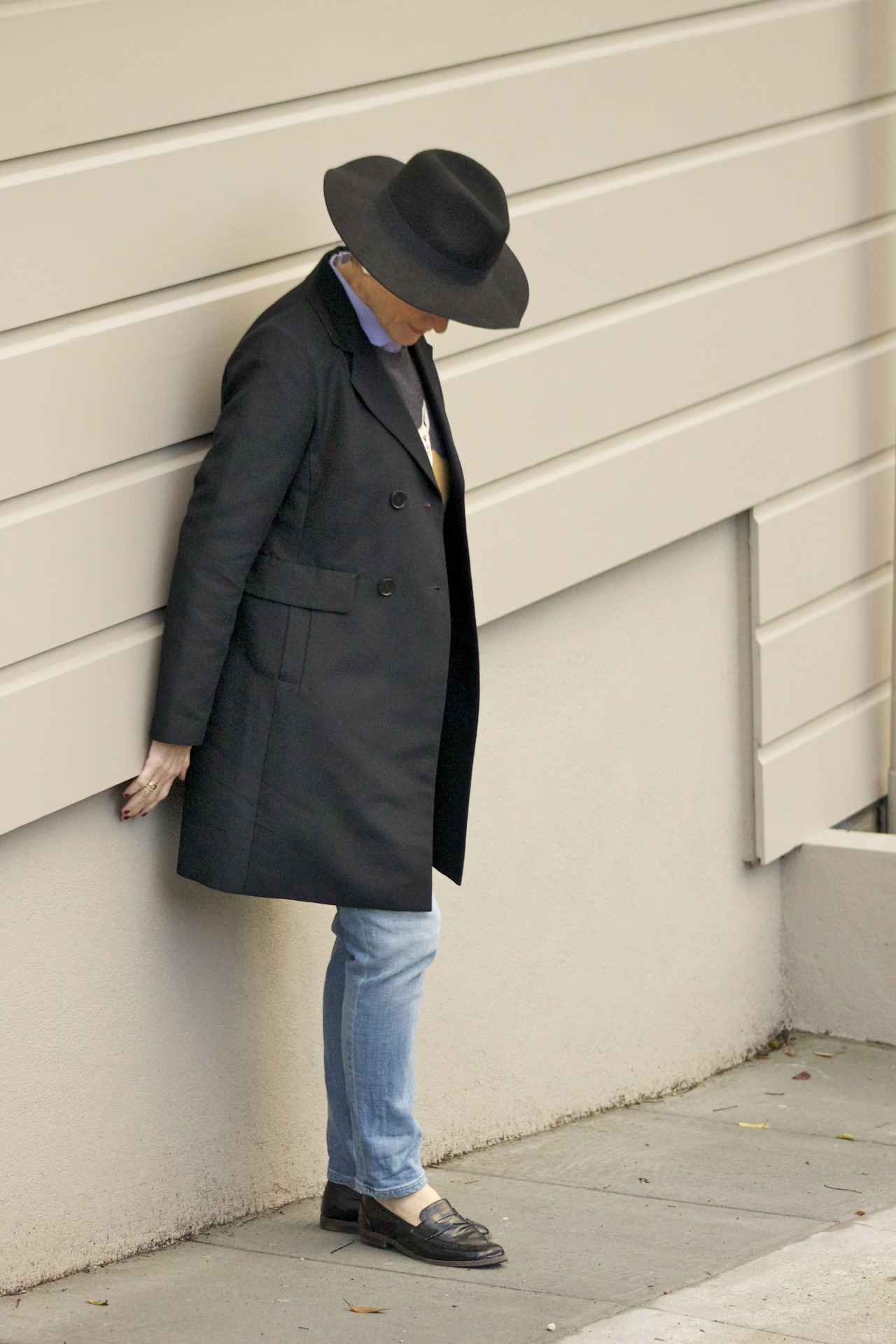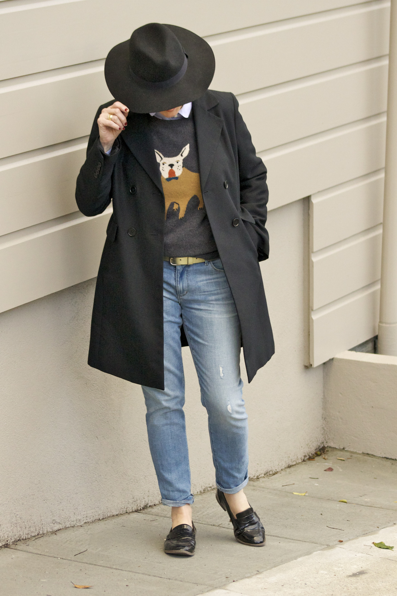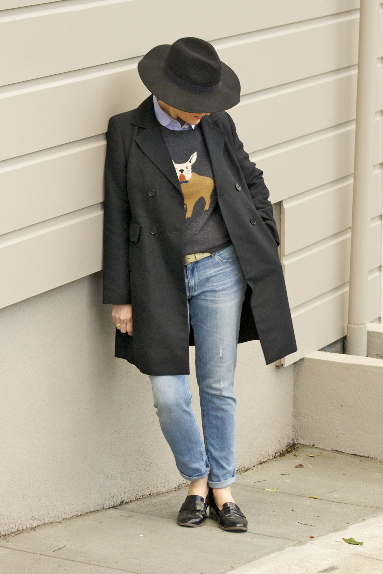 denim @Loft; sweater @JCrew; shirt @JCrew; trenchcoat @Talbots; belt @JCrew; shoes @OldNavy; hat @CottonOn