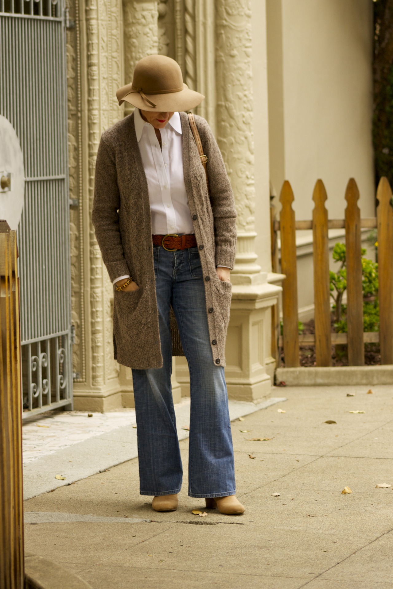 denim @BananaRepublic; shirt @H&HTailor; sweater @AnnTaylor; belt @BananaRepublic; boots @BananaRepublic; hat @Target; handbag @Fendi