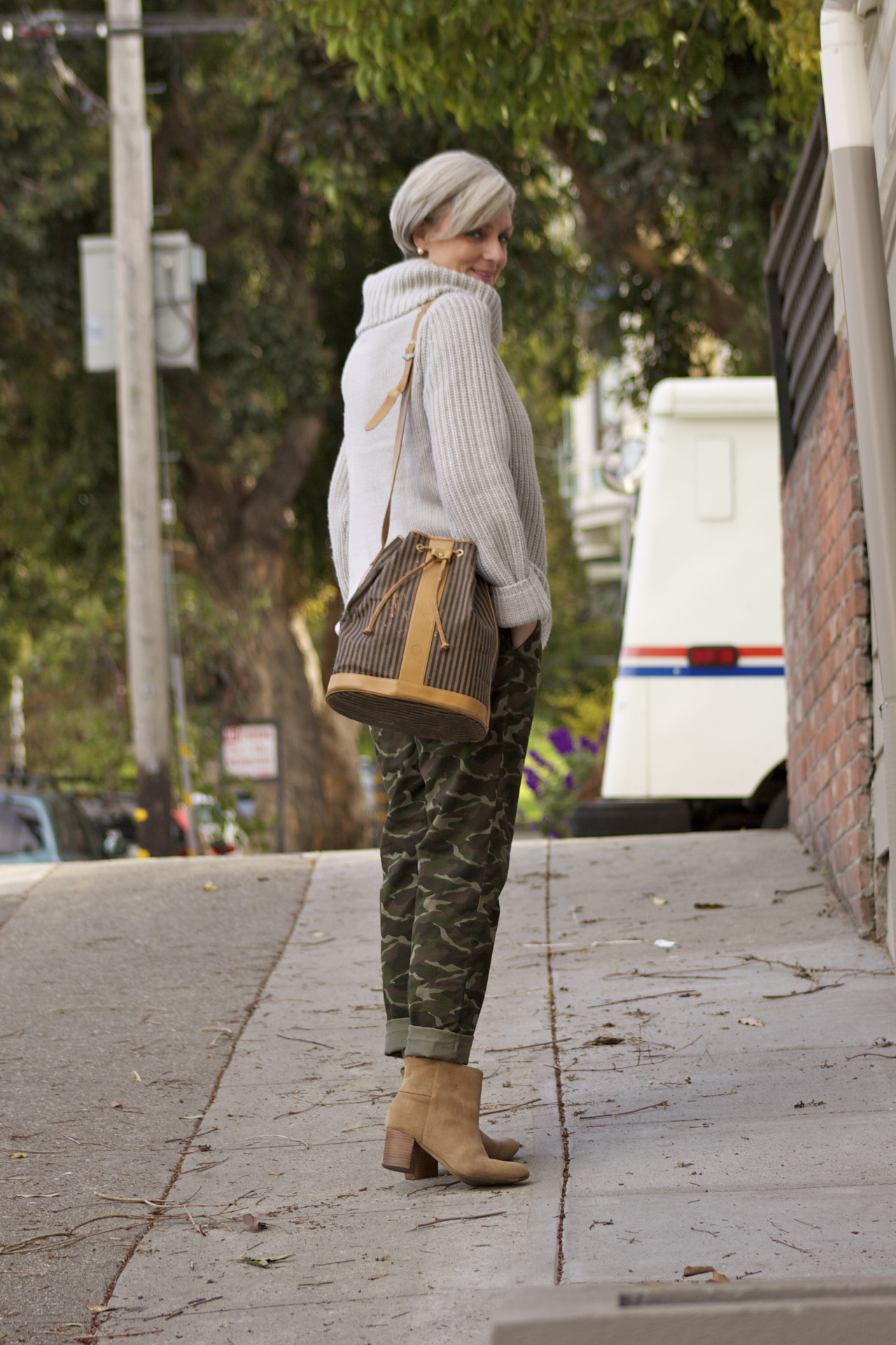 chinos by Gap; sweater by Banana Republic; booties by Banana Republic; handbag by Fendi; sunglasses by RayBan