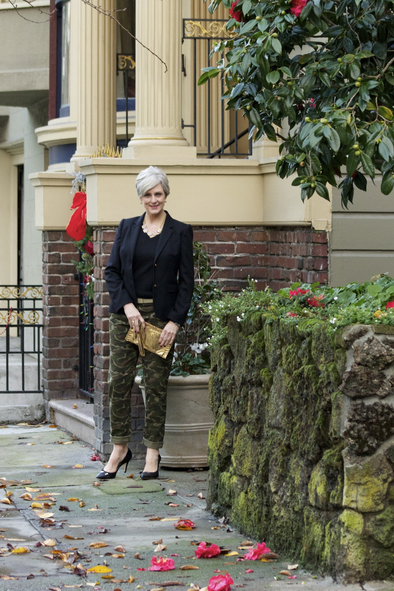 if you are off to a casual christmas party why not bend the rules a little? i kept the look simple today although i brought in a little bling with my gold necklace, belt and clutch. this is about all the sparkle i show on any given day due to the fact i am the most ‘unblingy’ girl out there. for some reason it just doesn’t work for me – believe me i’ve tried. but give me a schoolboy blazer and a pair of chinos, and voila – i relax, my breathing eases – because this is what i feel content with – simple, comfortable, but eye-catching. you see, i’ve had years and years of trial and error as far as fashion goes, honing fashion into style, and if i have learned anything it is this: you have to own your look. if you don’t feel like the boss when you stand in front of that dressing room mirror then the look isn’t for you. and don’t be persuaded by slashed price tags. i promise, there will be another sale. most likely next week. hone your look, ladies. own your look. there is only one you in the world!