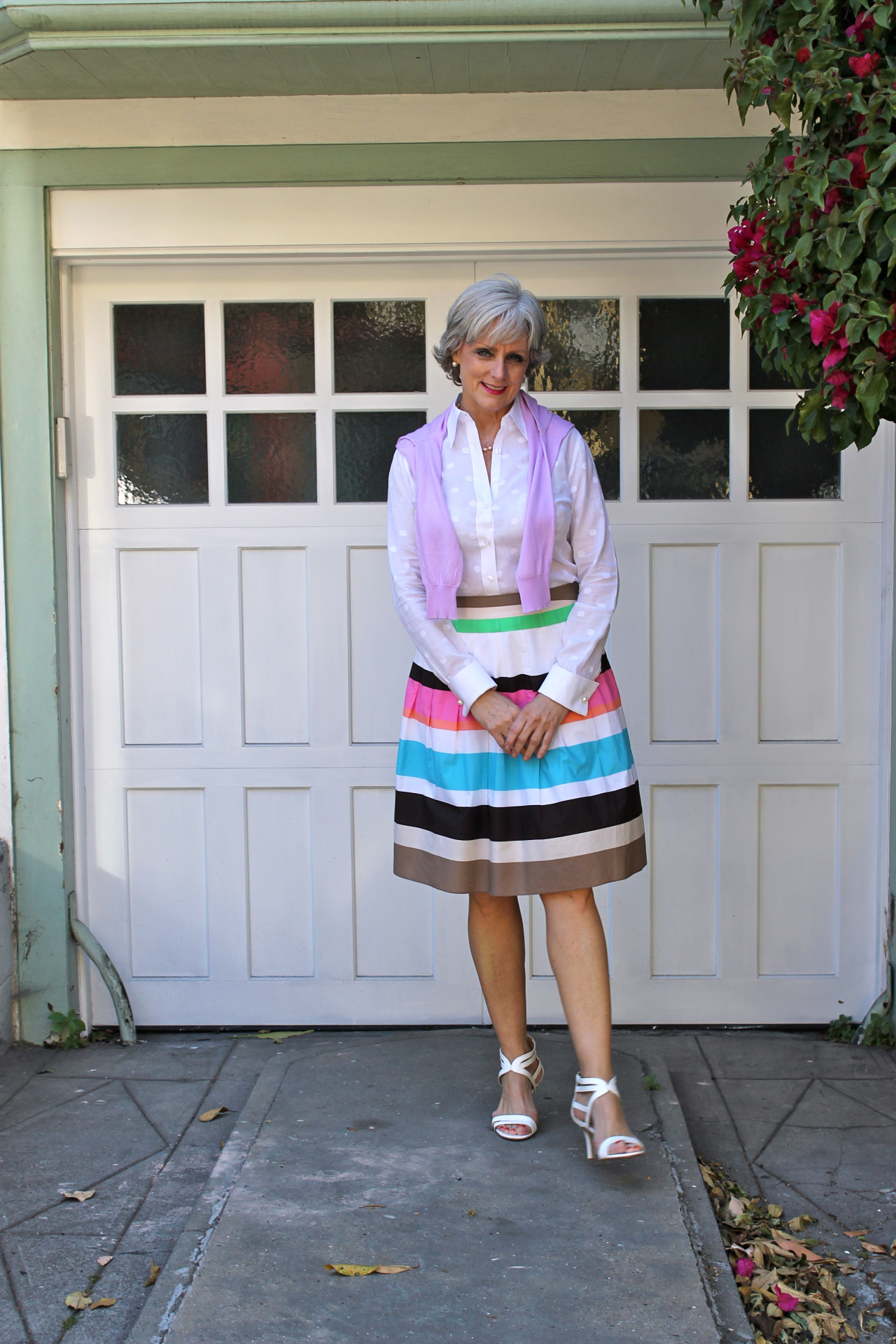 skirt by Talbots; blouse by H&H tailors; sweater by JCrew; shoes by Nine West