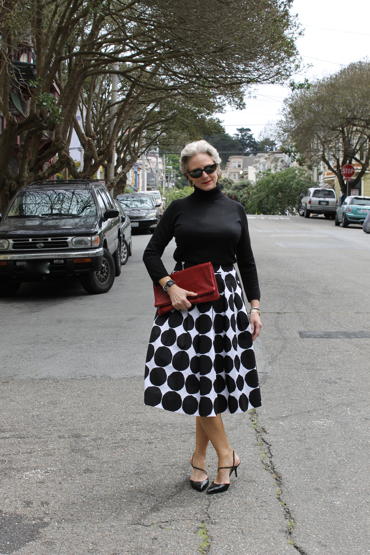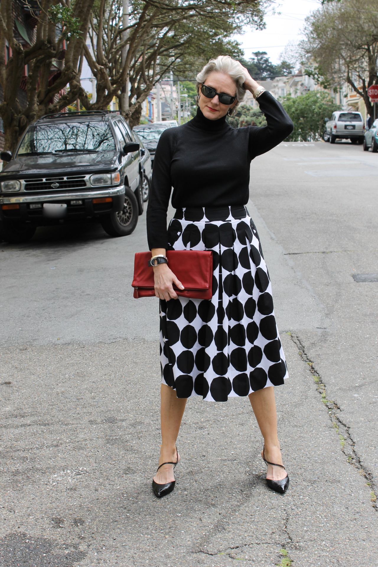 skirt by Banana Republic x Marimekko; sweater by Inc.; handbag by Mark and Graham; sunglasses by Ray Ban; shoes by Ivanka Trump