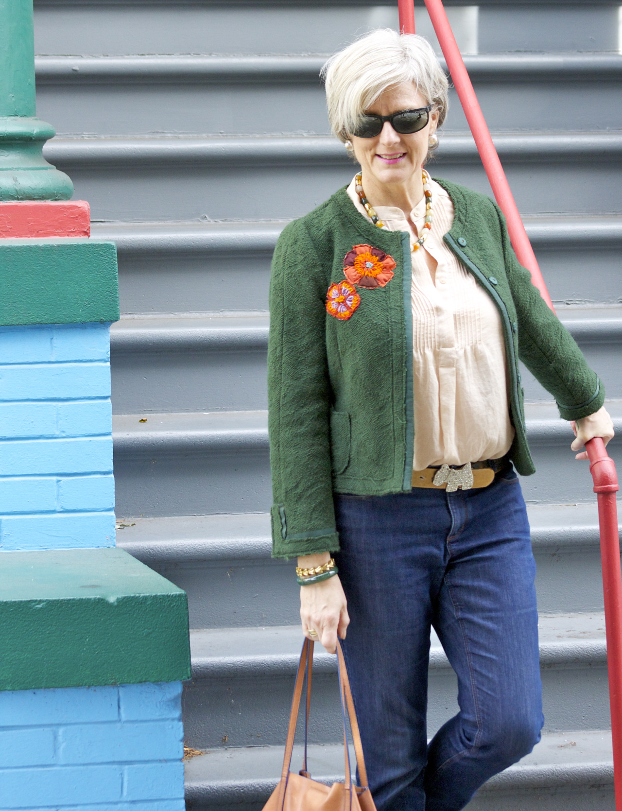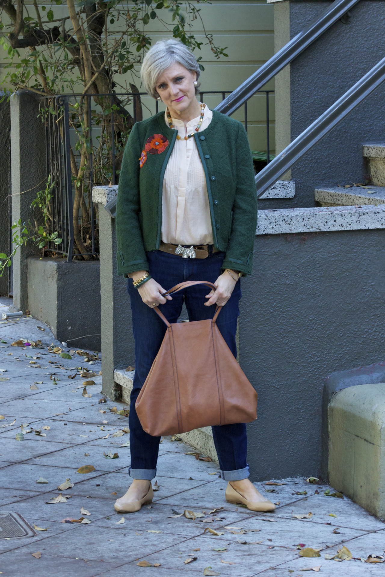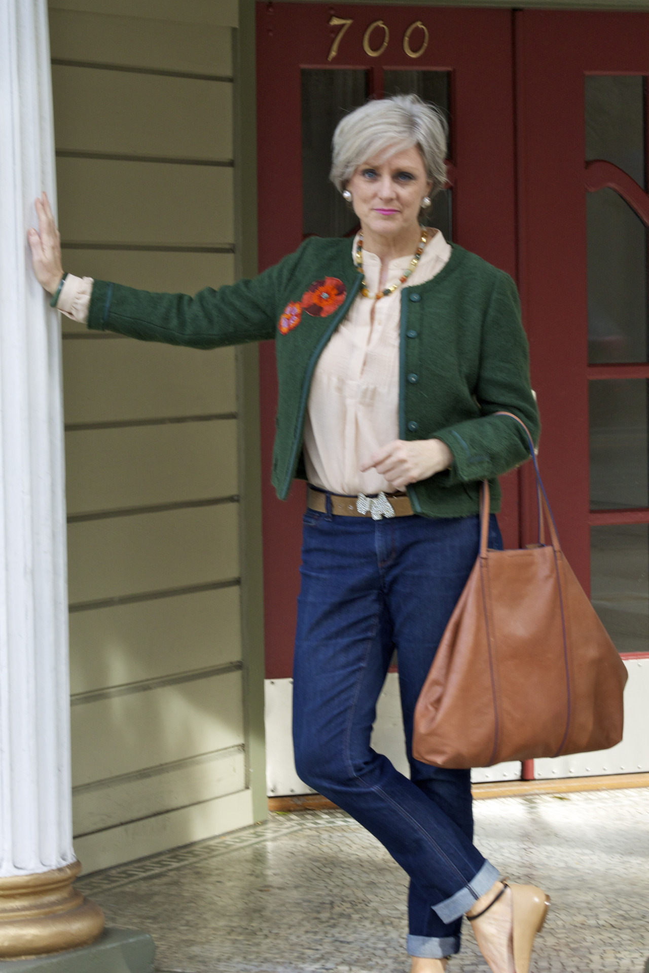 denim @AnnTaylor; shirt @Mango; jacket @Zara; belt @AgnesB; tote @Madewell; shoes @BananaRepublic