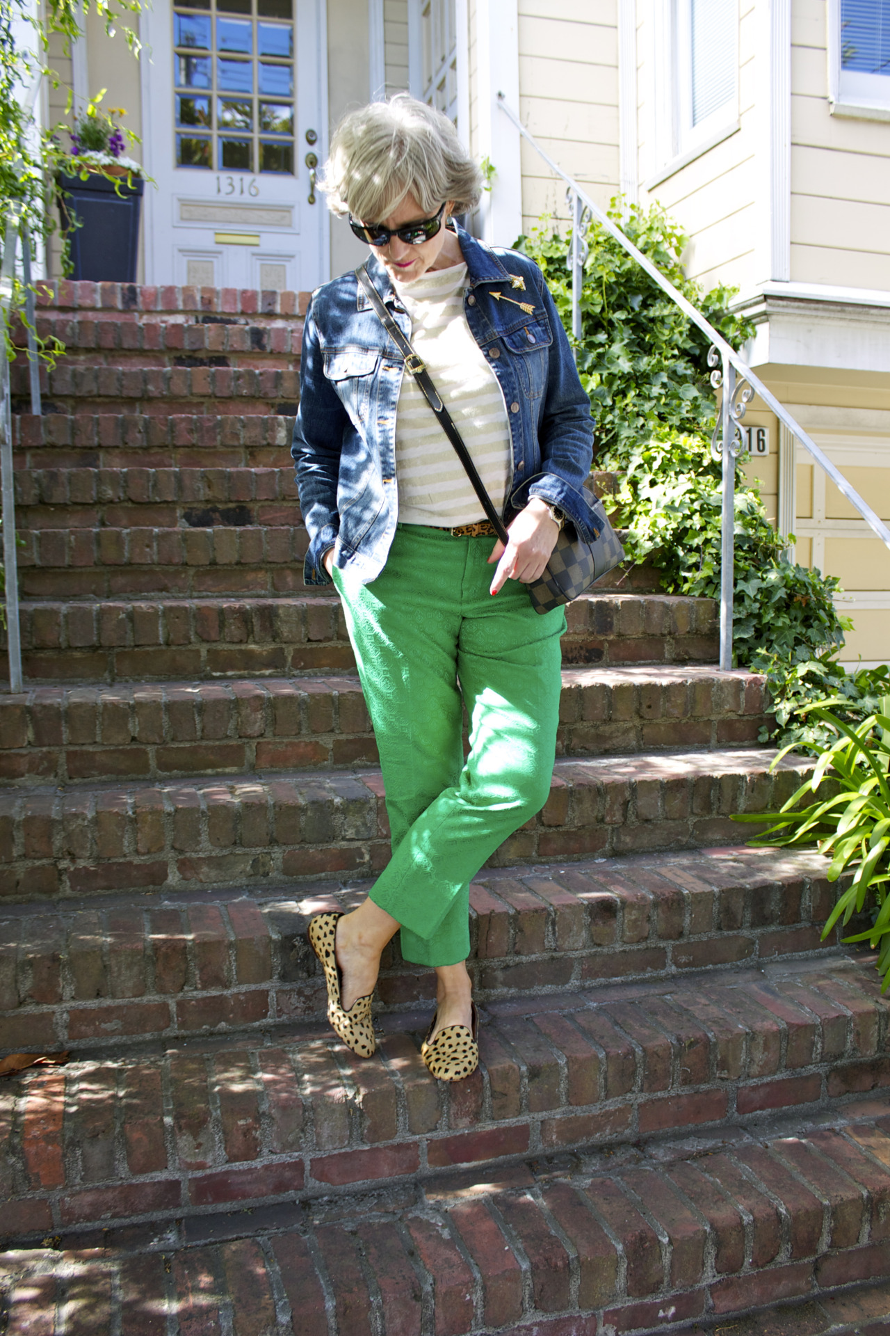 pants by Banana Republic; tee by JCrew; denim jacket by Old Navy; shoes by Madewell; belt by JCrew; handbag by Fendi