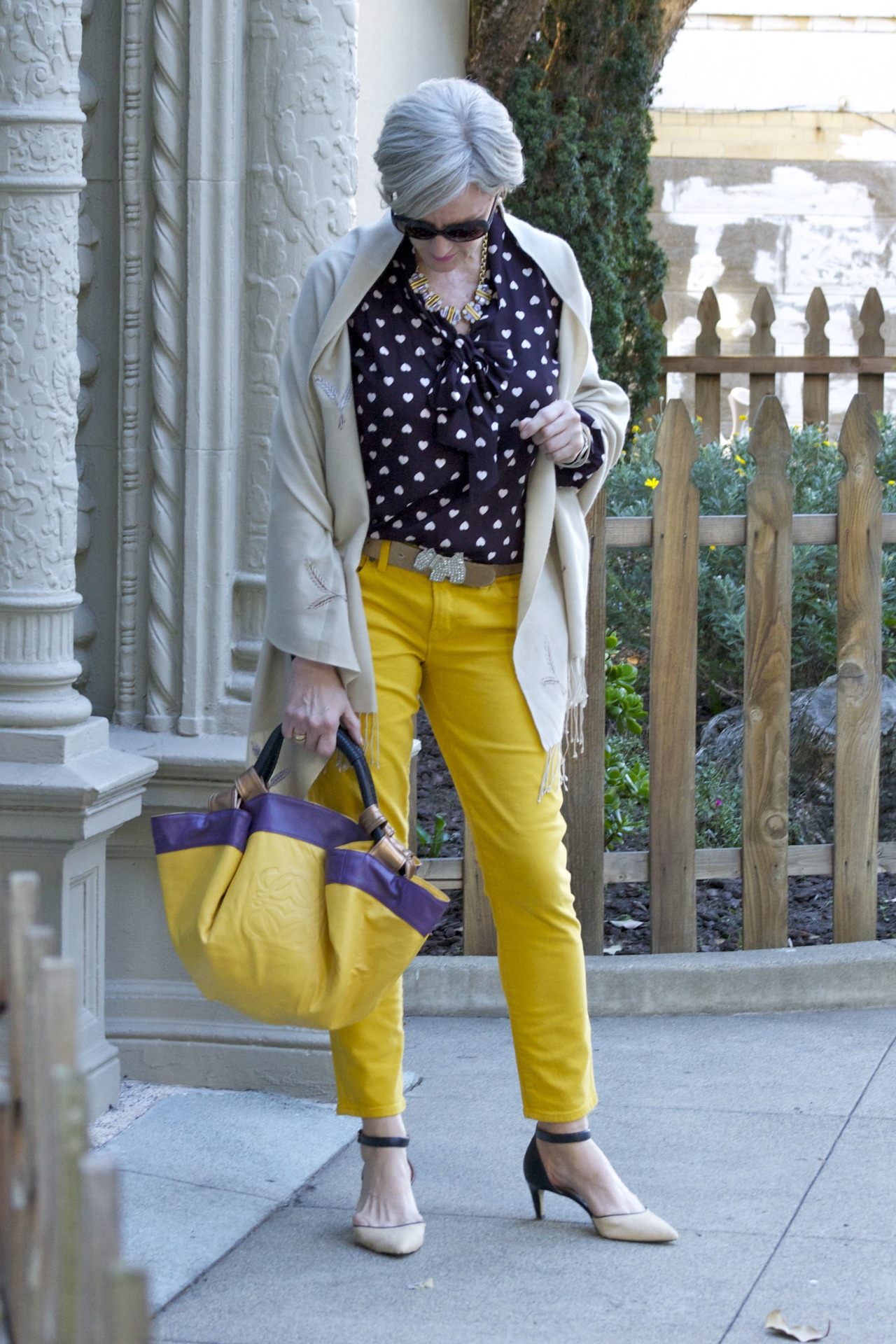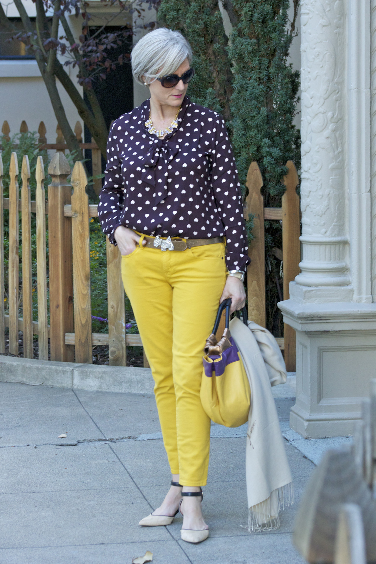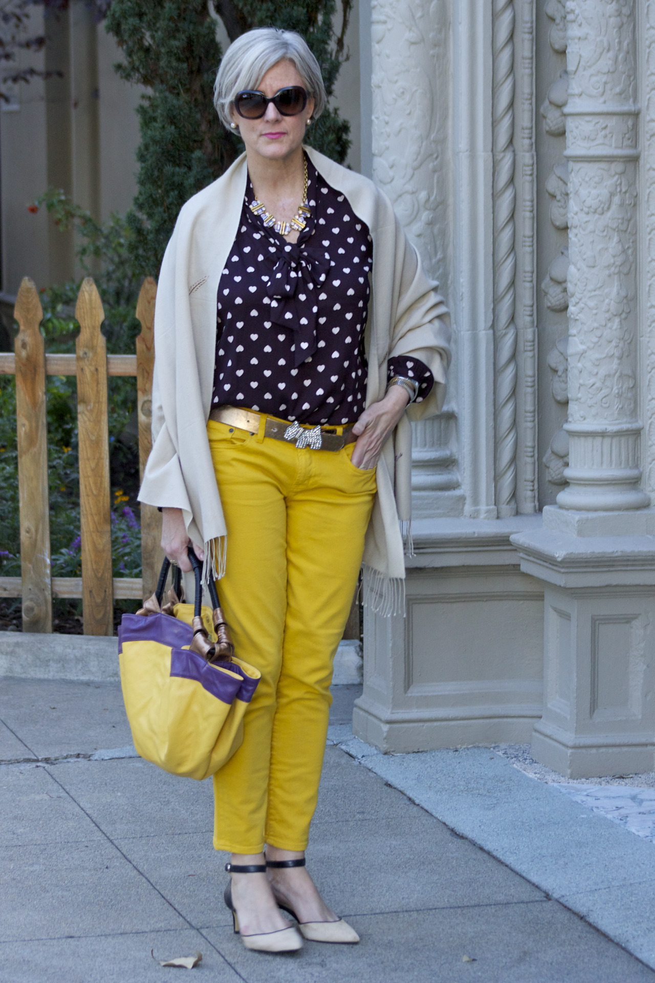 denim @JCrew; blouse @LOFT; belt @Agnes B; vintage pashmina; handbag @Lowe; sunglasses @RayBan