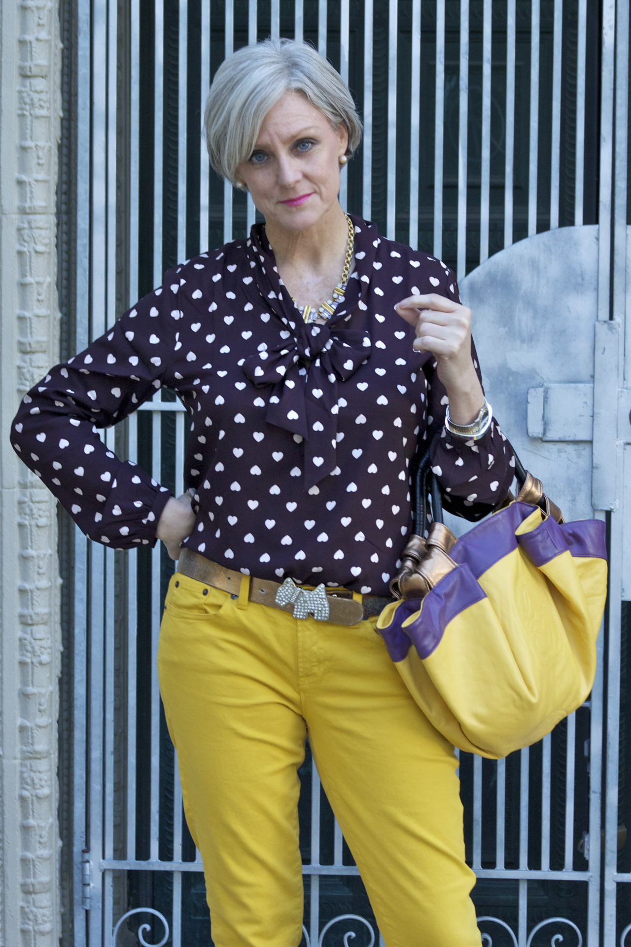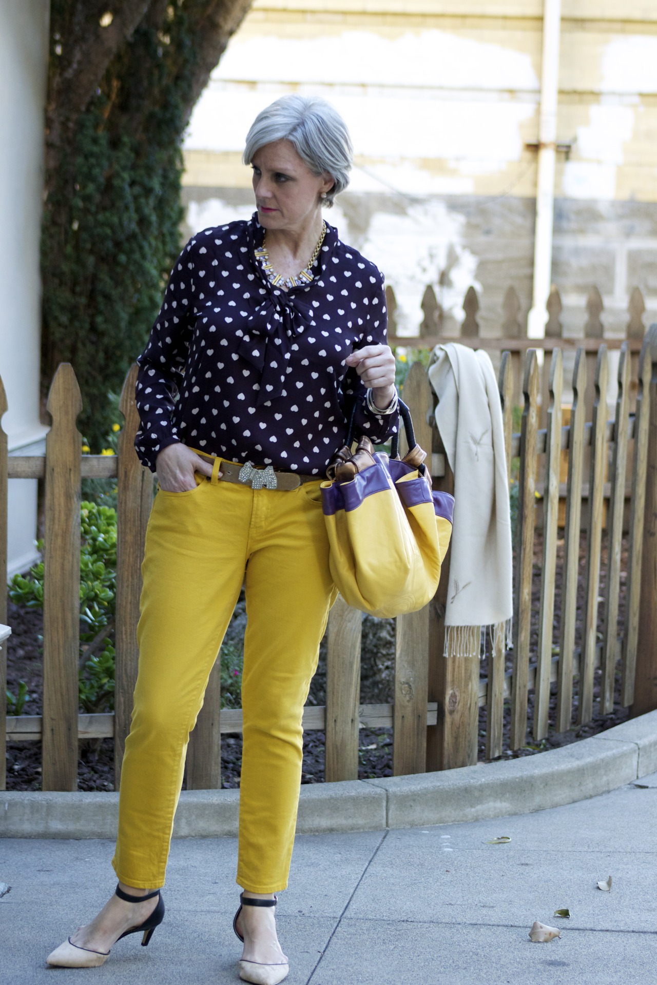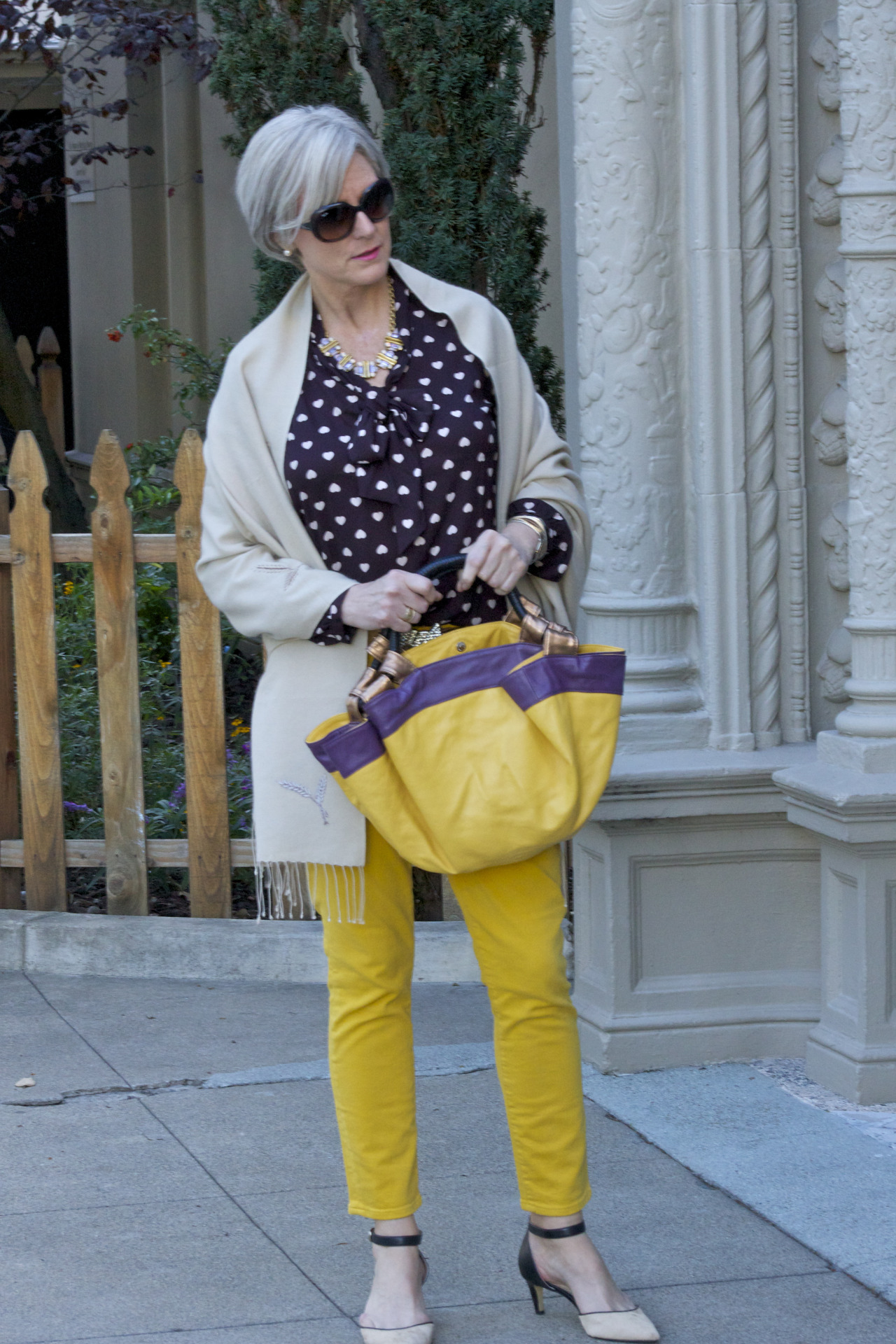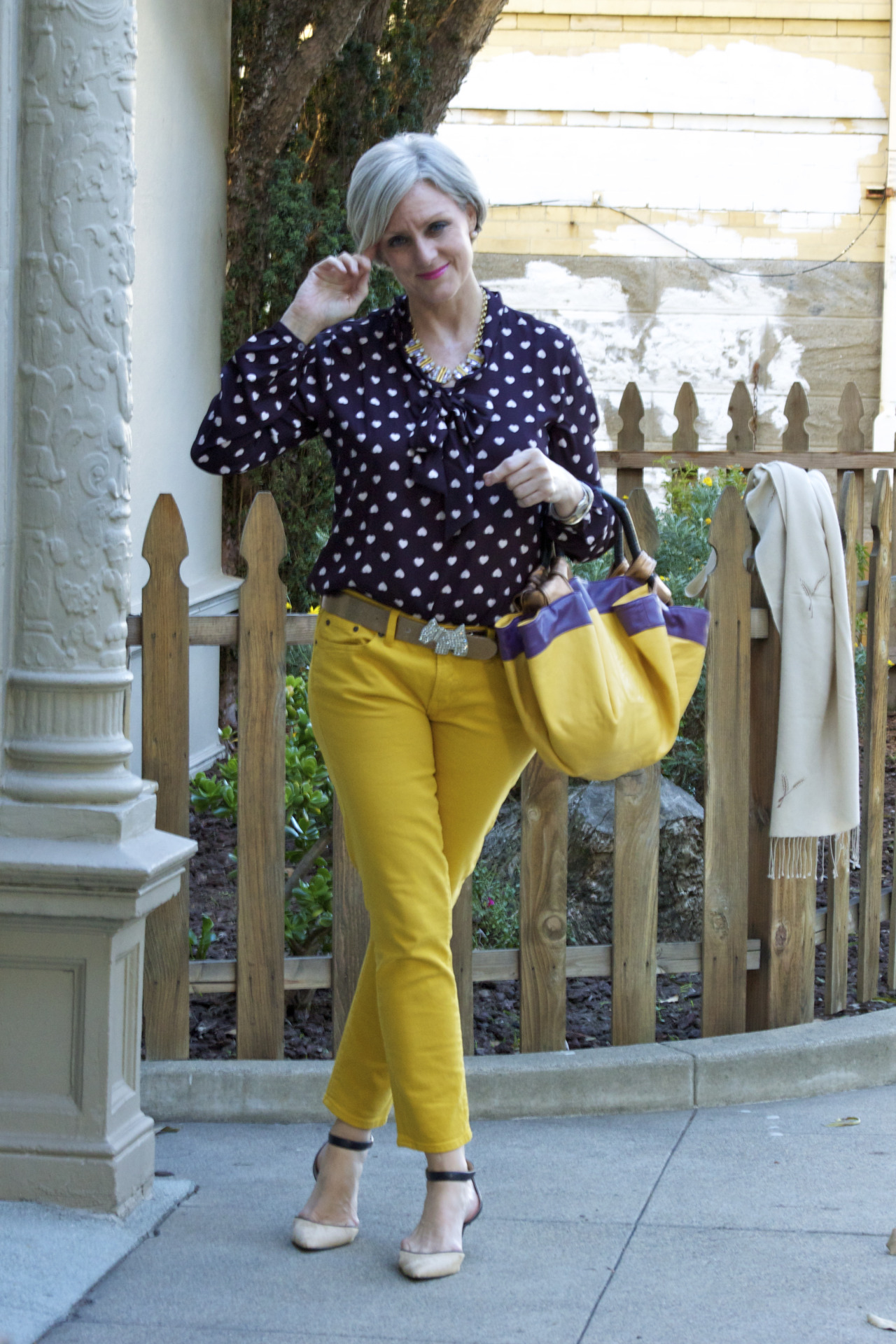 denim @JCrew; blouse @LOFT; belt @Agnes B; vintage pashmina; handbag @Lowe; sunglasses @RayBan