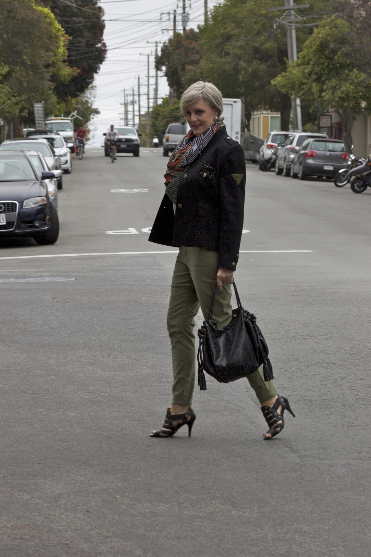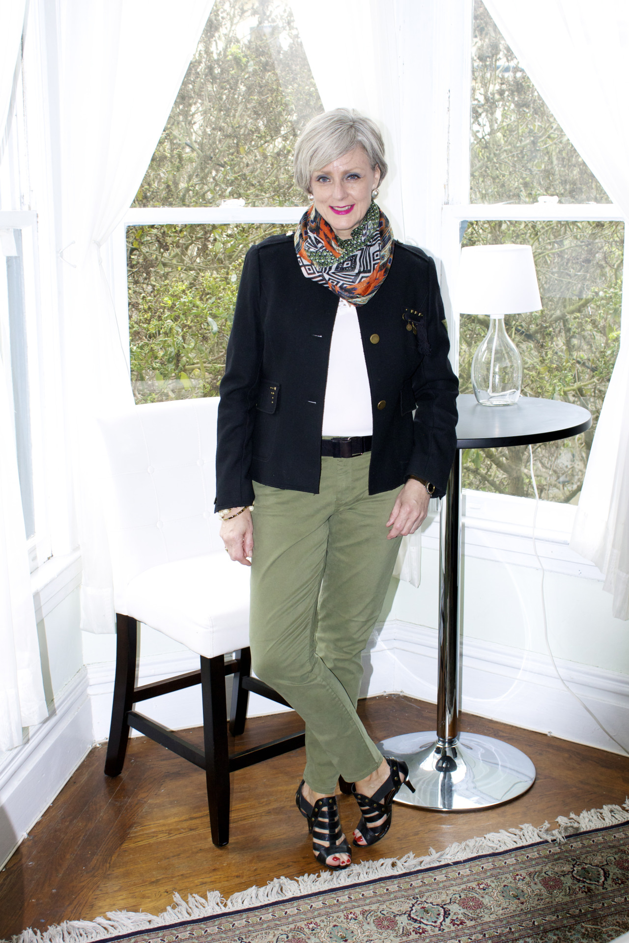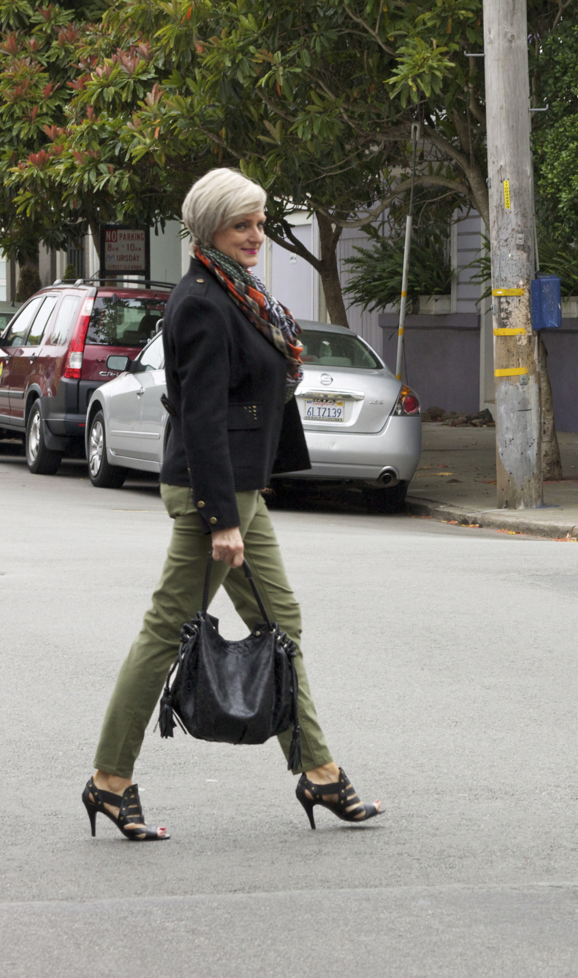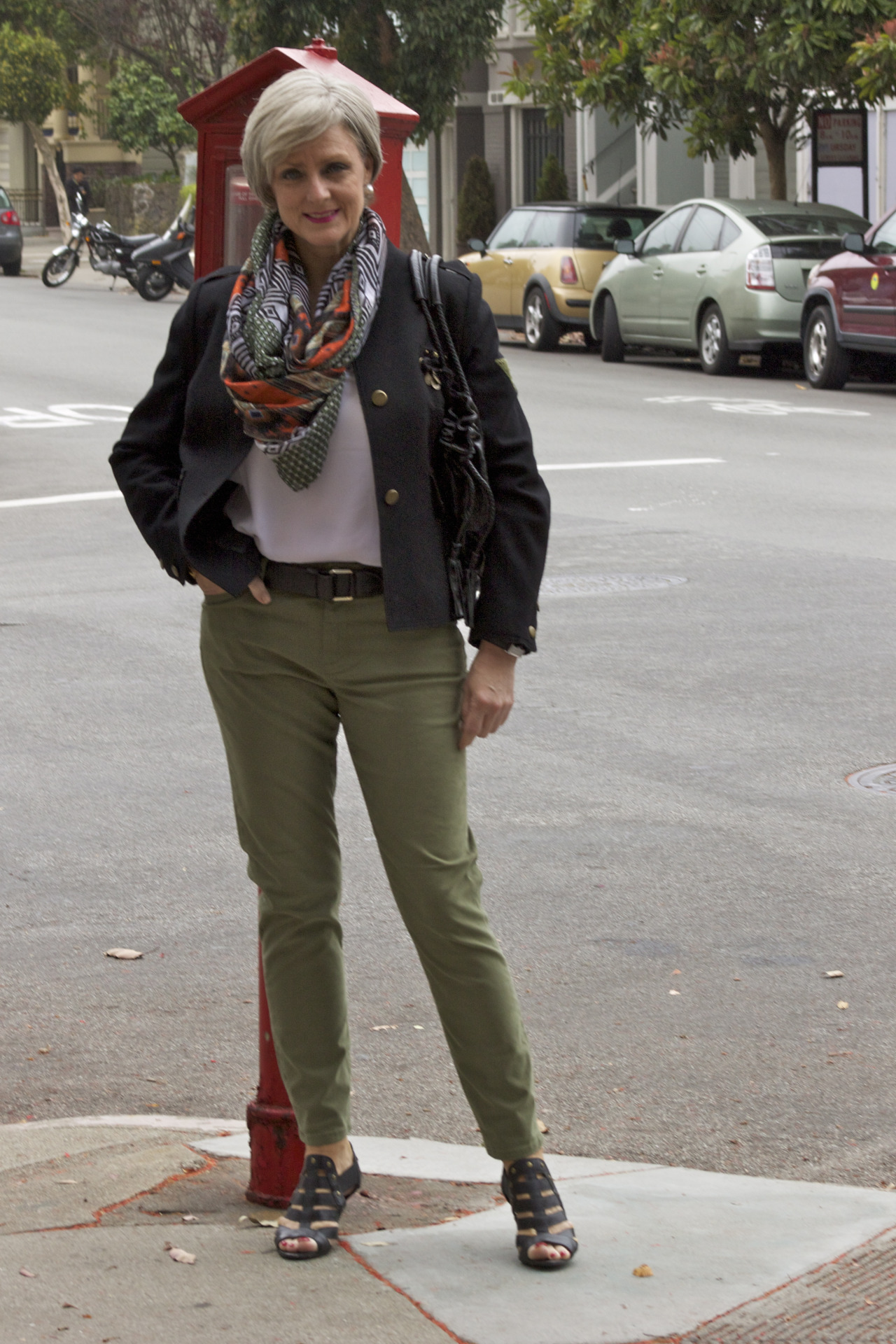 an iconic military jacket easily translates into a fun fall look when paired with green pants. it’s a timeless look that can be updated with shoes or a scarf. i kept the color scheme very neutral with black shoes and handbag. the only pop of color comes from the scarf.