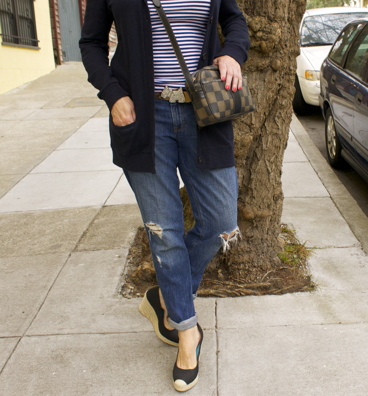 tee by Gap; cardigan by JCrew; denim by JCrew; handbag by Fendi; belt by Agnes B