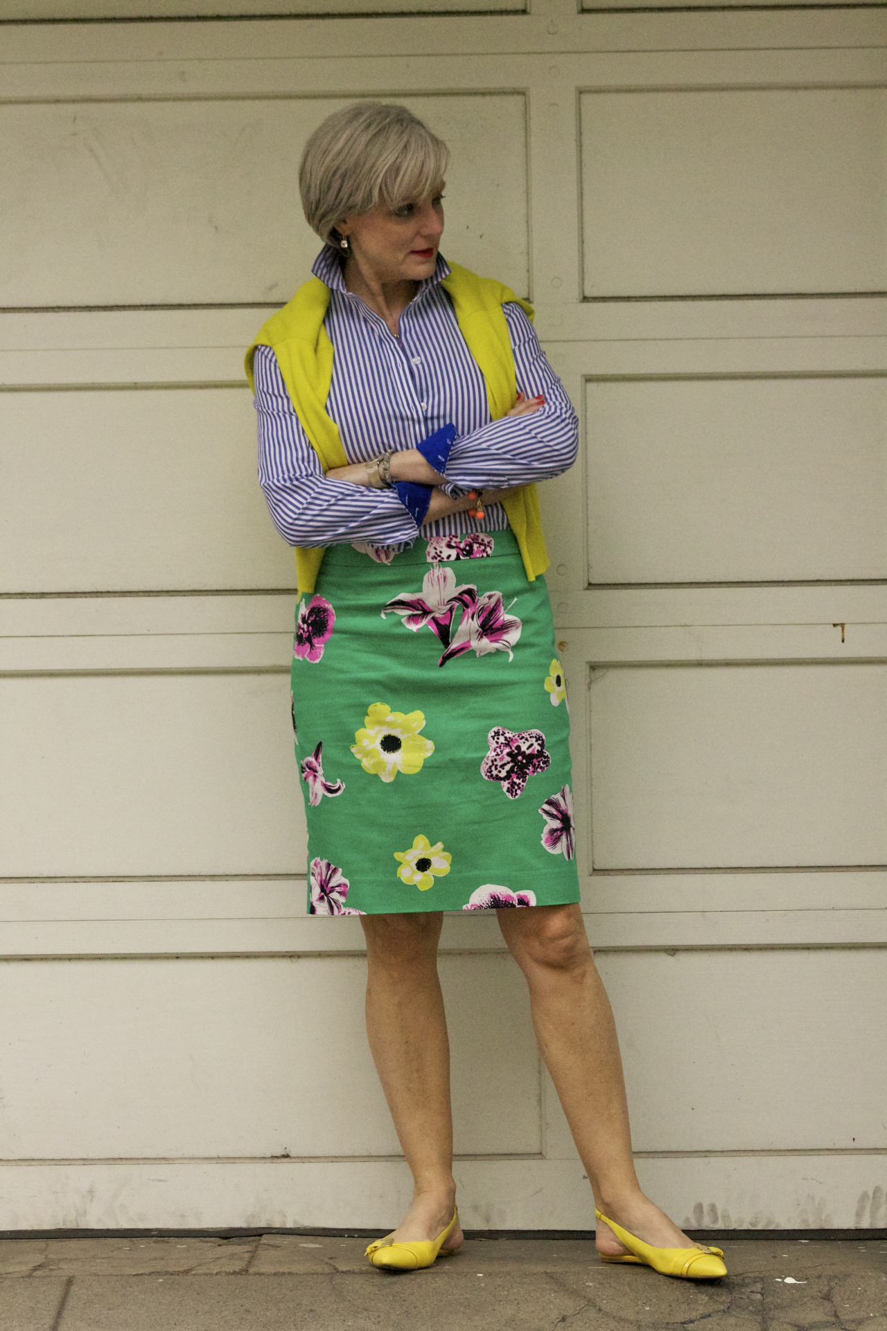 skirt by JCrew Factory; shirt by Banana Republic; sweater by Banana Republic; shoes by Nine West; bracelet and Necklace by JCrew