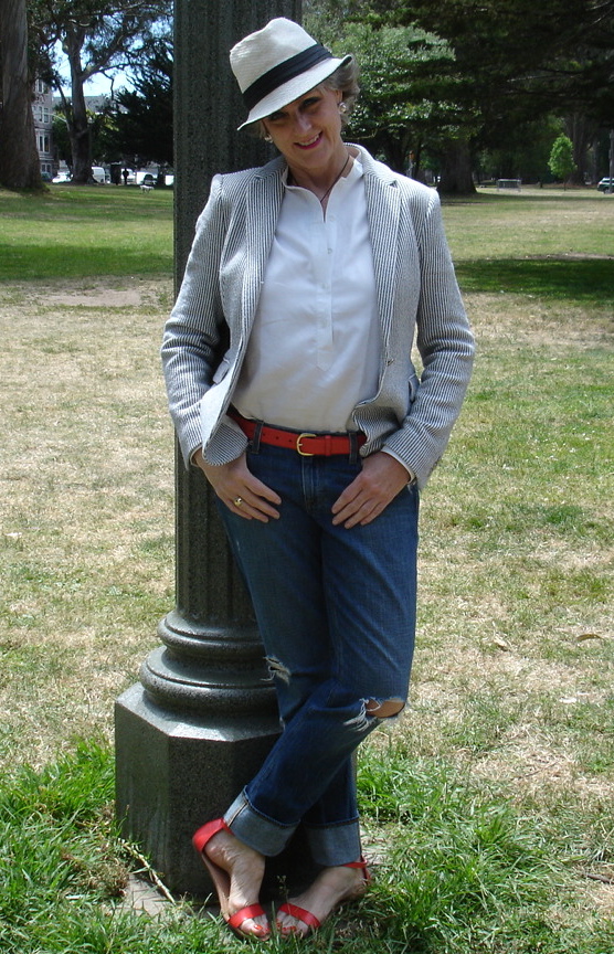 blazer by Zara; Shirt by H&H tailors; denim by JCrew; Sandals by Old Navy; belt by Banana Republic