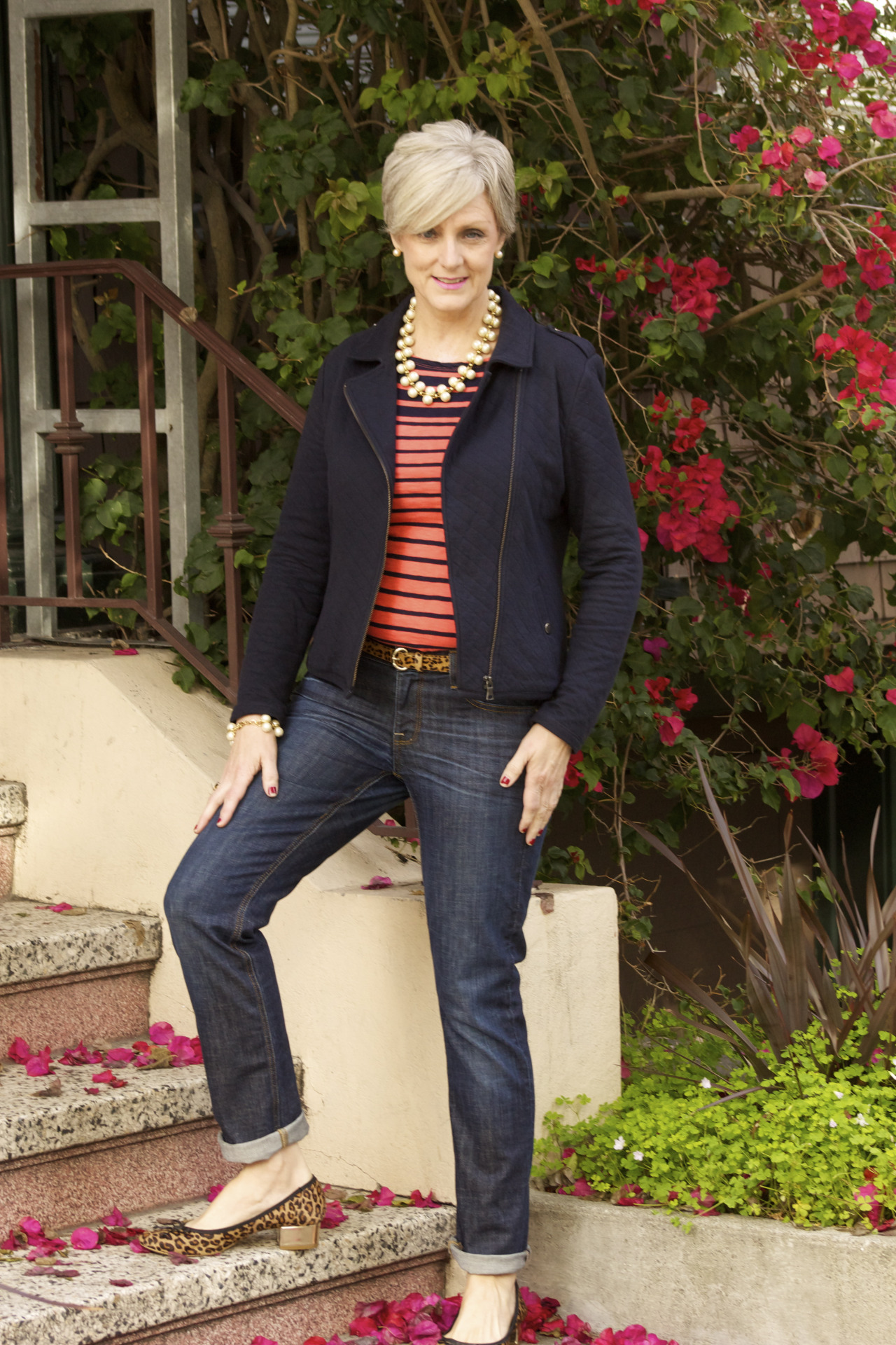 denim @JCrew; tee @JCrew; blazer @BananaRepublic; shoes @BananaRepublic; belt @JCrew; necklace and bracelet @JCrew