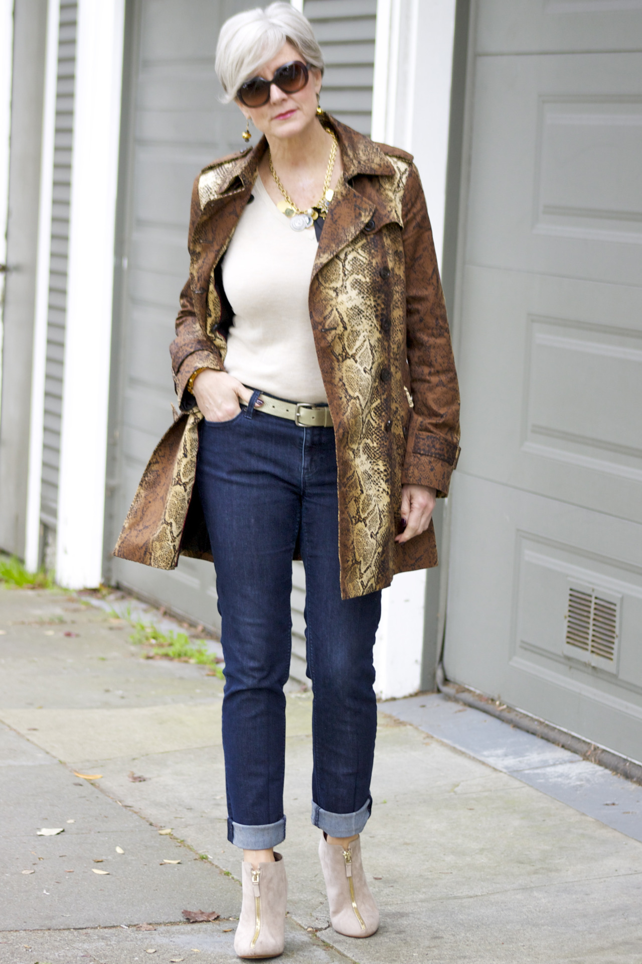 with a nod toward minimalism i’m easing into the weekend with a mix of neutrals. nothing ornate about this outfit, except for the snakeskin print on the trench, but the color palette that ranges from camel to mocha brown helps keep the look subdued. for a fleeting moment i considered throwing on a pair of cream colored chinos for a monochromatic look, but since i’m really a blue jean girl at heart, and it’s friday, i went with my trusty pair of dark rinse denim. happy weekend!