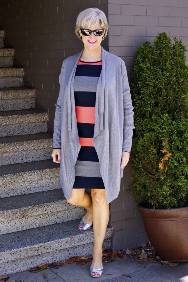 dress by Banana Republic; sweater by Ann Taylor; sandals by Talbots; sunglasses by Talbots