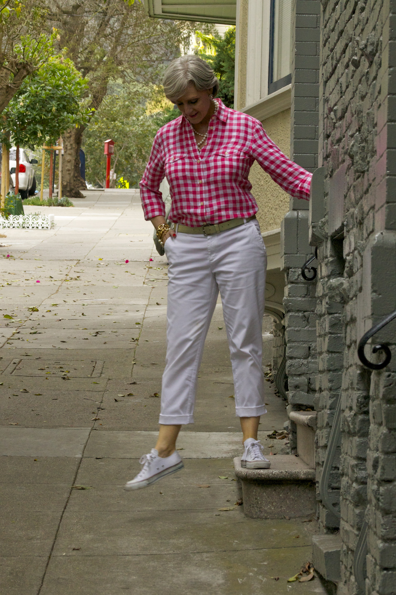 chinos by Banana Republic; shirt by Banana Republic; belt by JCrew; sneakers by Converse
