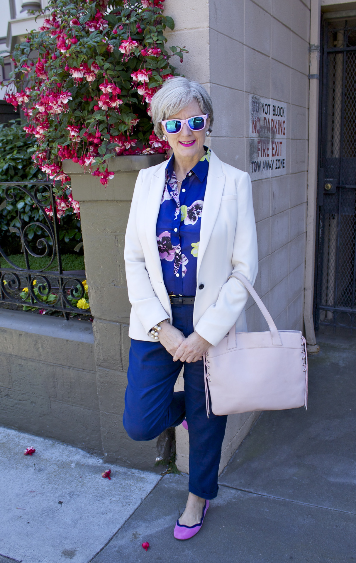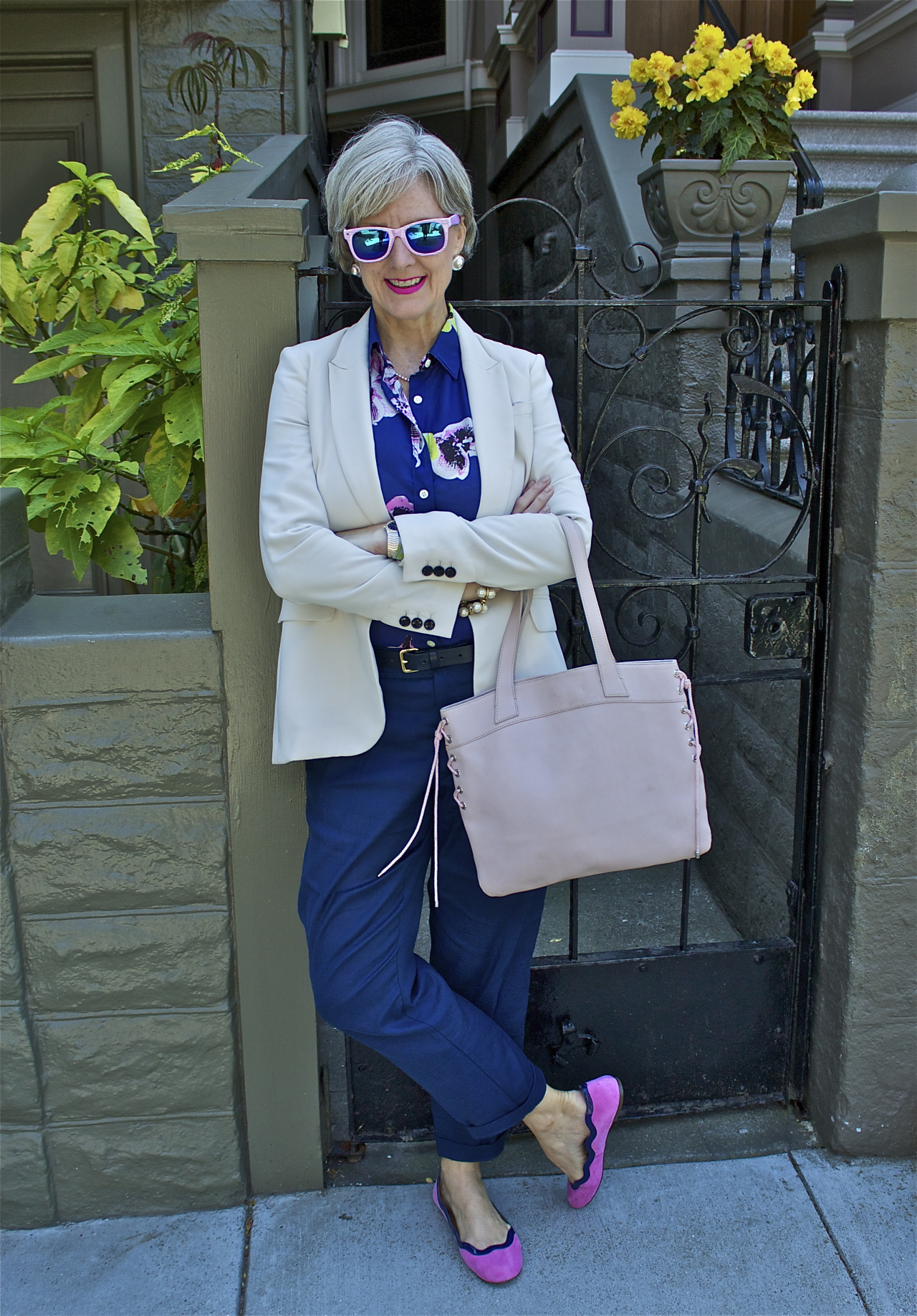 blazer by Banana Republic; pants by Banana Republic; shirt by JCrew; shoes by JCrew; sunglasses by Target;
