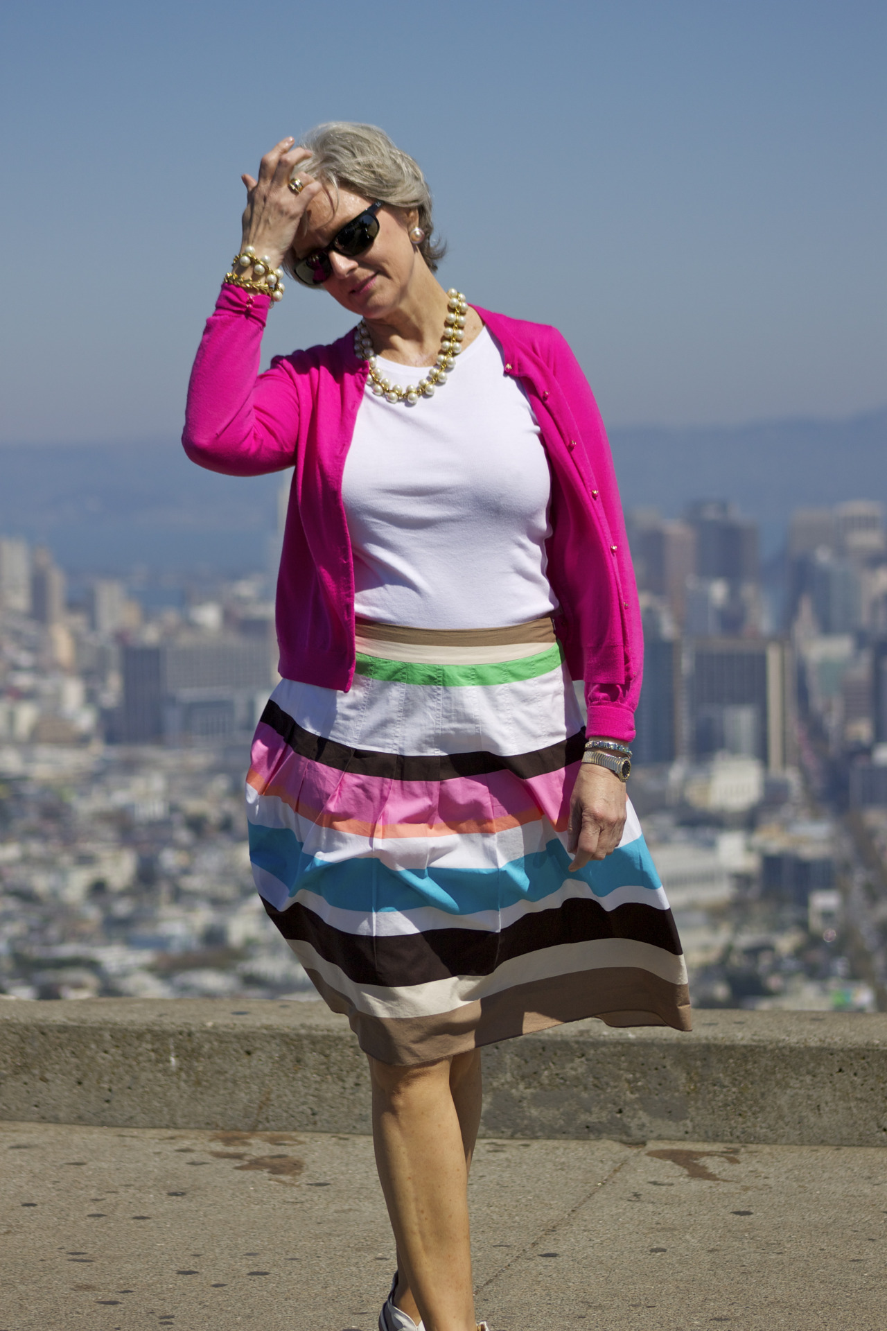 skirt by Talbots; tee by Old Navy; sweater by JCrew; shoes by Enzo Angiolini; necklace by JCrew; sunglasses by Ray-Ban