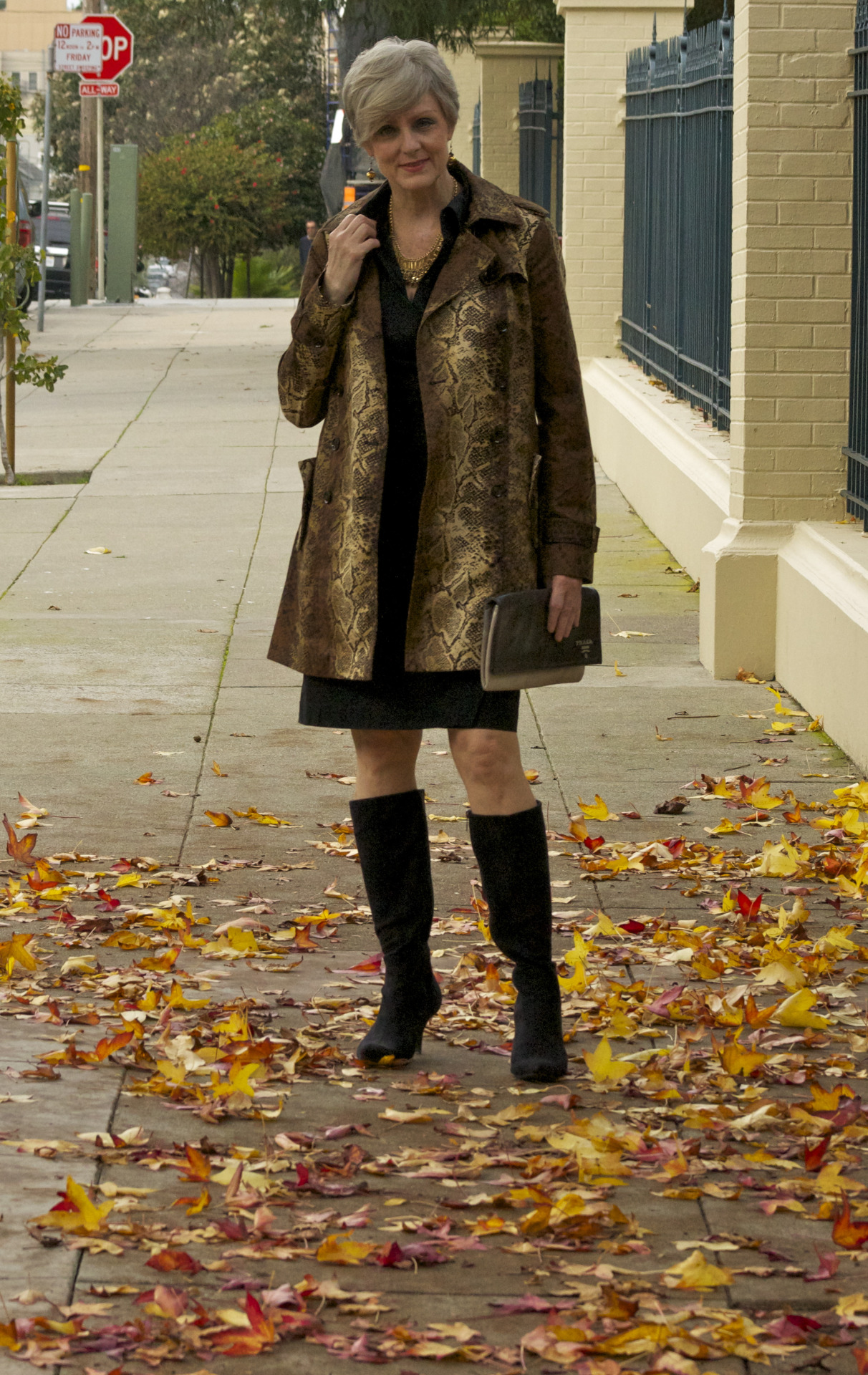 dress @AnnTaylor; trenchcoat @BananaRepublic; boots @CalvinKlein; handbag @Prada