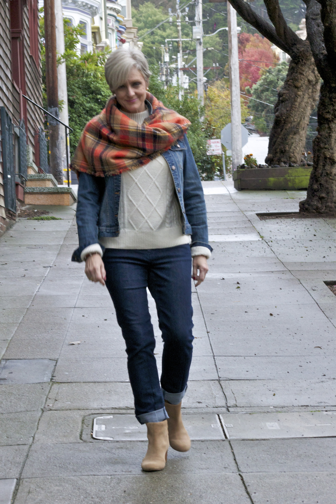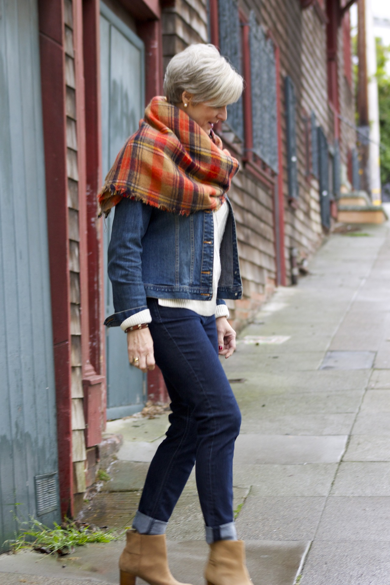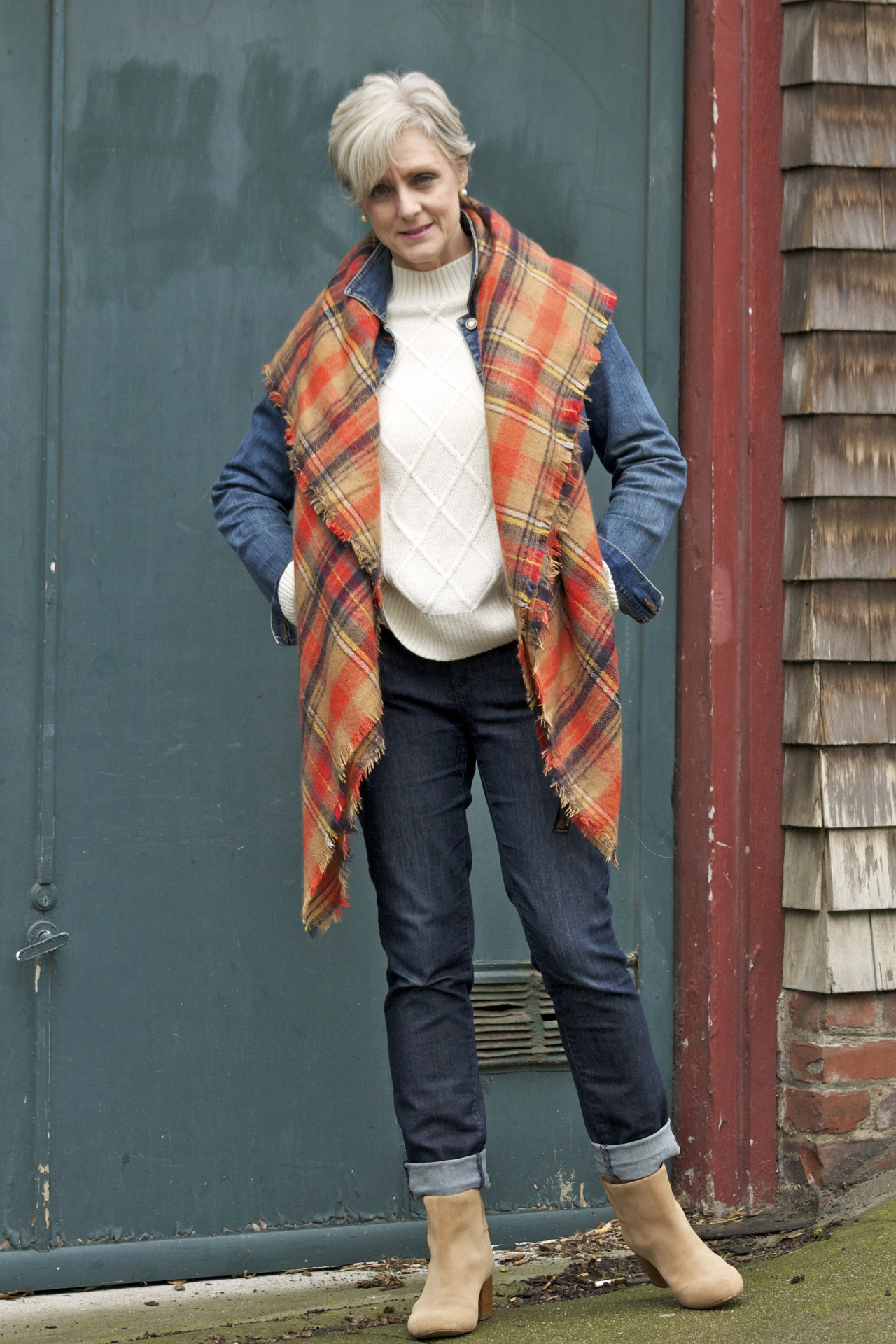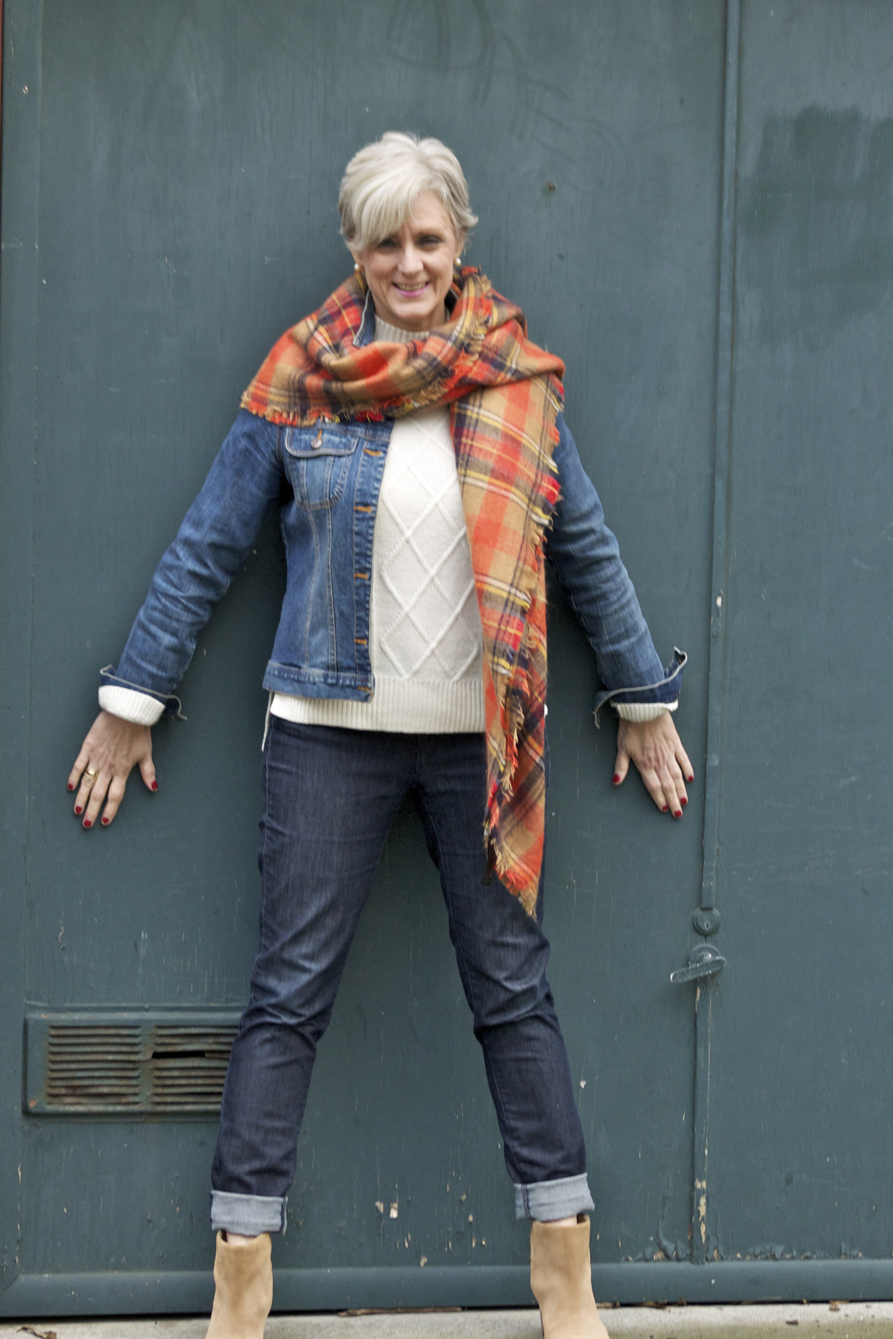 denim @AnnTaylor; sweater @OldNavy; jacket @OldNavy; scarf @Zara; boots @BananaRepublic