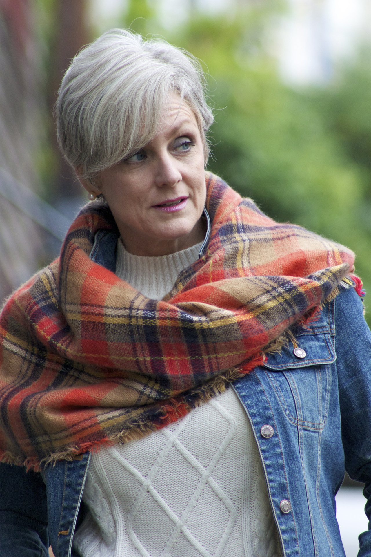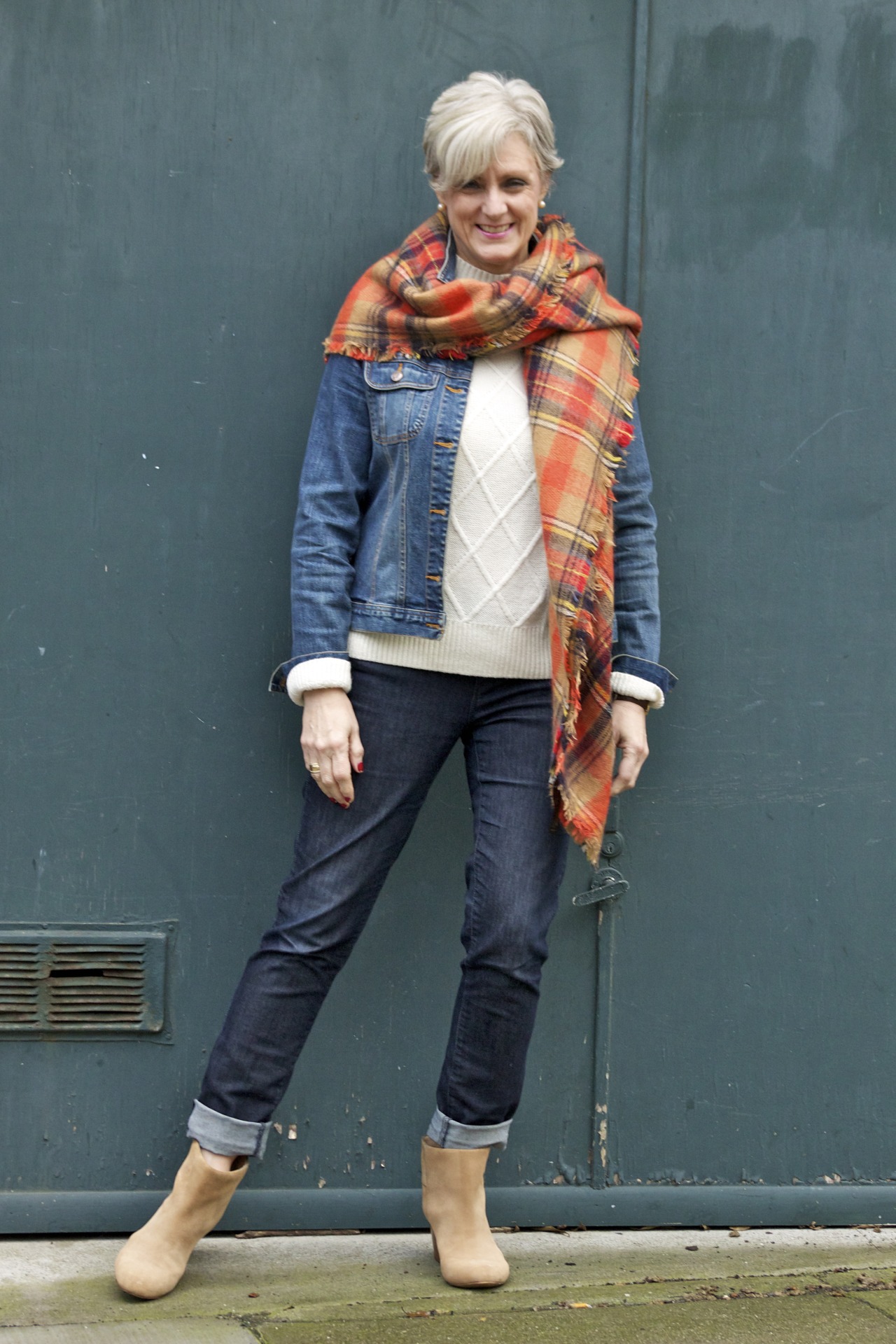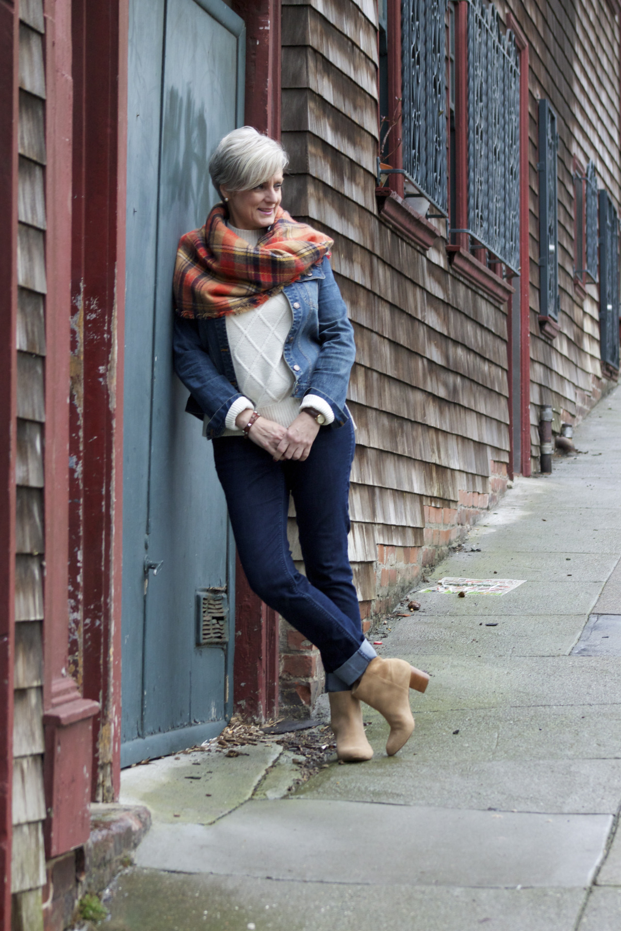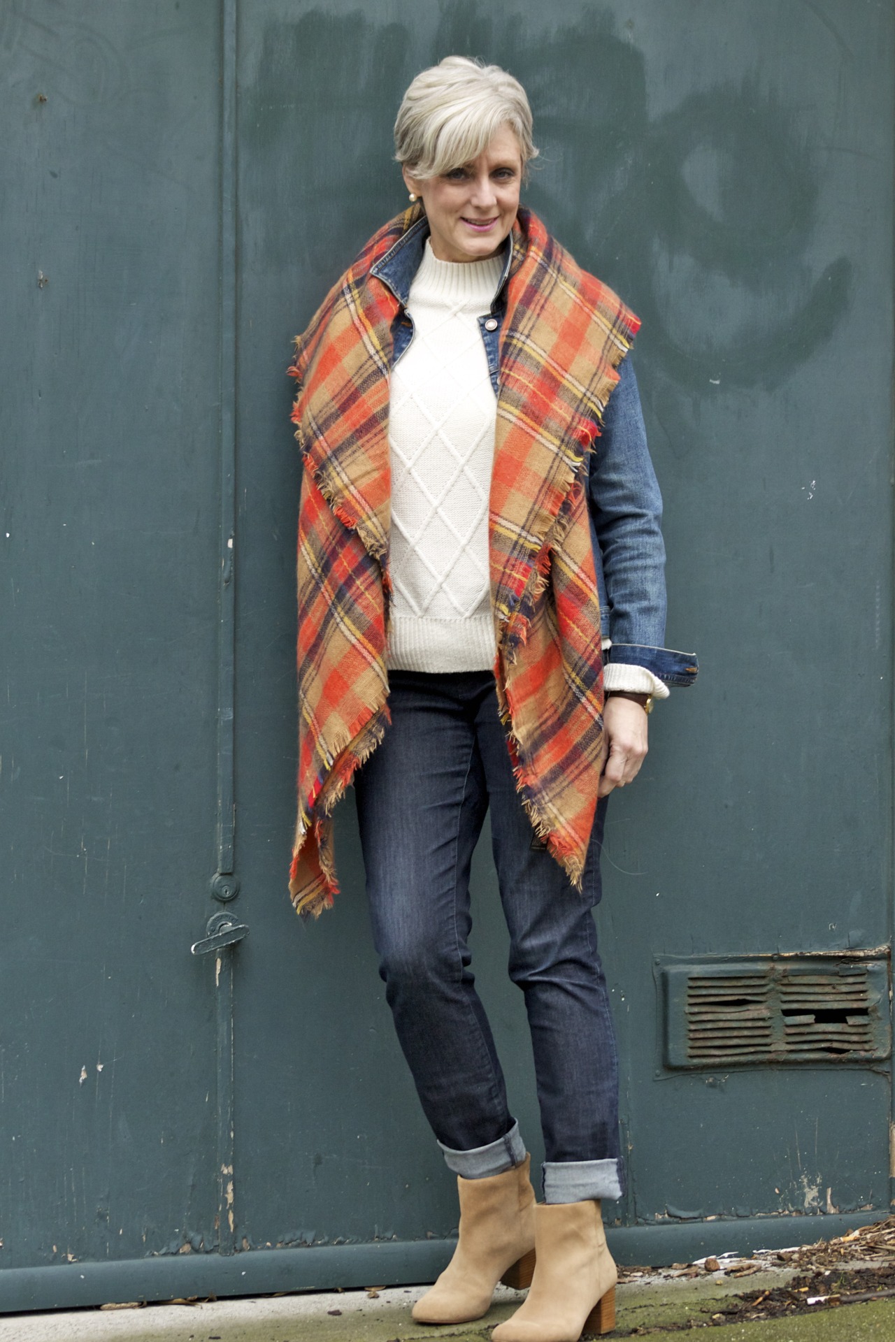denim @AnnTaylor; sweater @OldNavy; jacket @OldNavy; scarf @Zara; boots @BananaRepublic