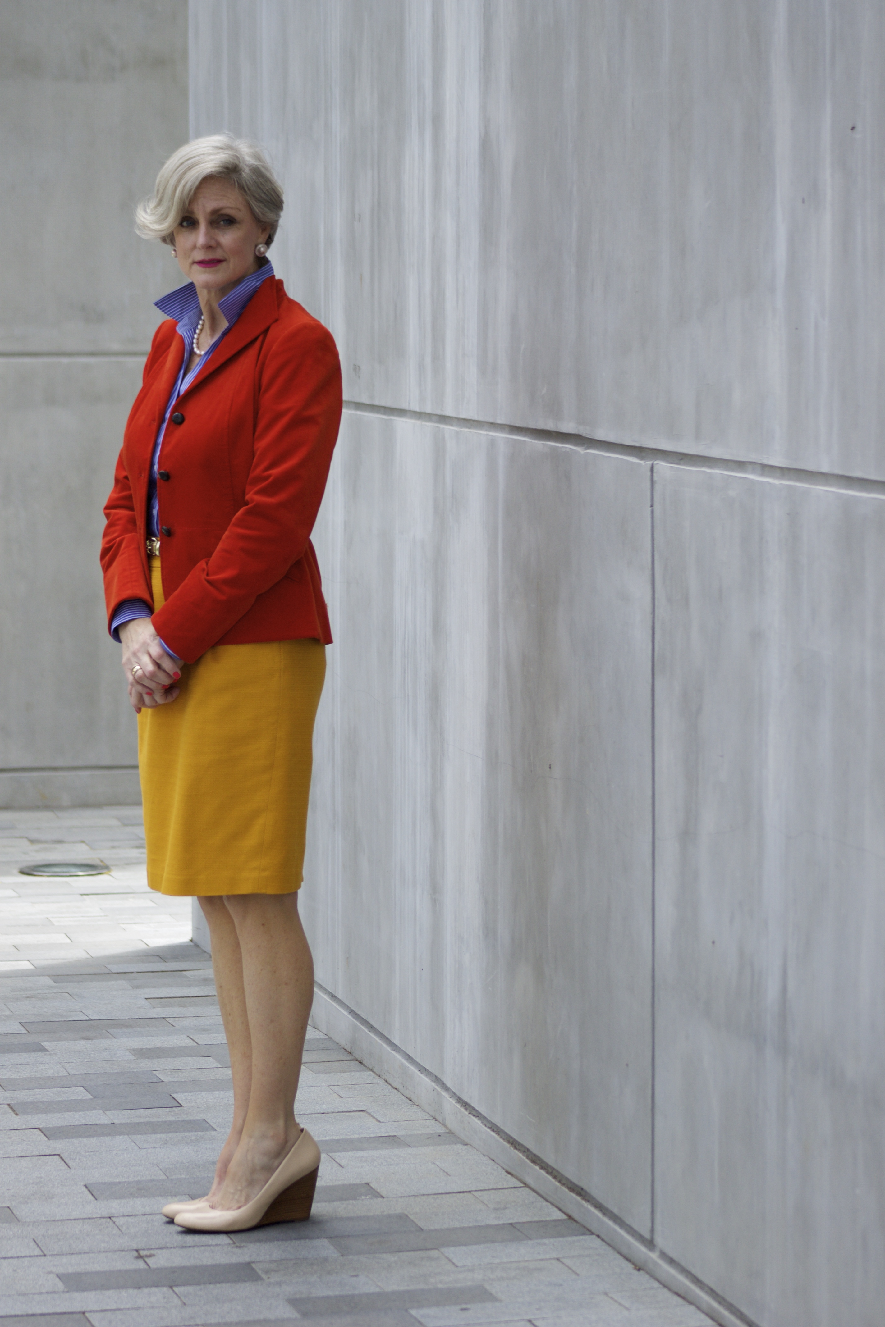 it’s back to basics for my nine-to-five ootd. pencil skirt, blazer, and a button down are the perfect pieces for a busy day at the office. but the color scheme is anything but boring, and that’s how i like to spice up these classic separates from time-to-time. the nude colored wedge shoes keep the outfit toned down, and happen to be one of the most comfortable pair of shoes i own. just for fun i threw in a metallic belt to cinch my waist. i know some of us are hesitant about accentuating our middle section when we reach a certain age, but if curvy girls do it with style and sass, why can’t we? so go ahead and experiment. get out of your comfort zone. remember, we don’t always have to play it safe when it comes to fashion.