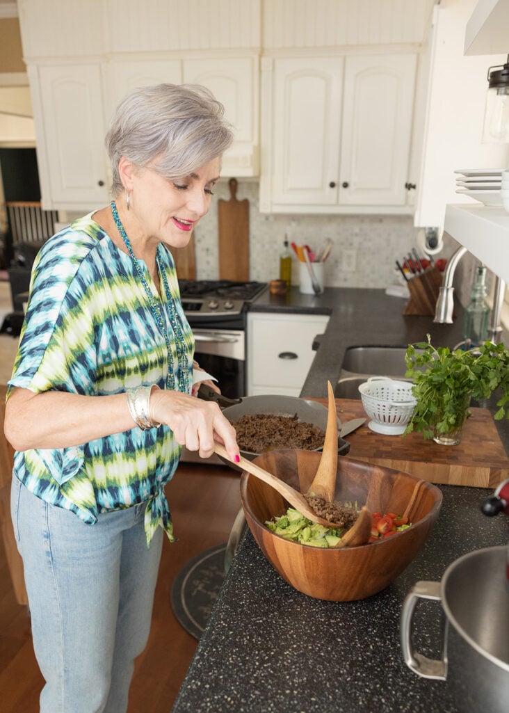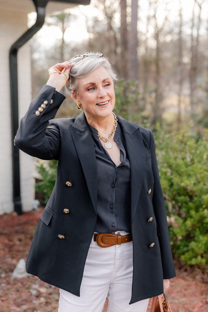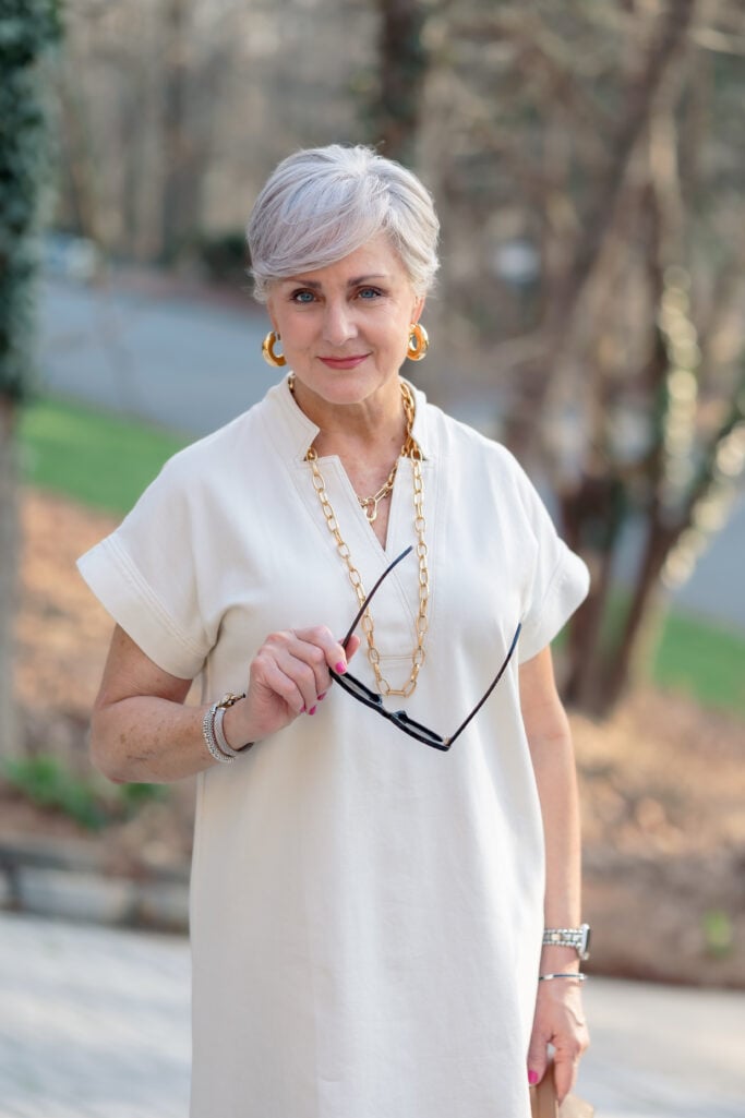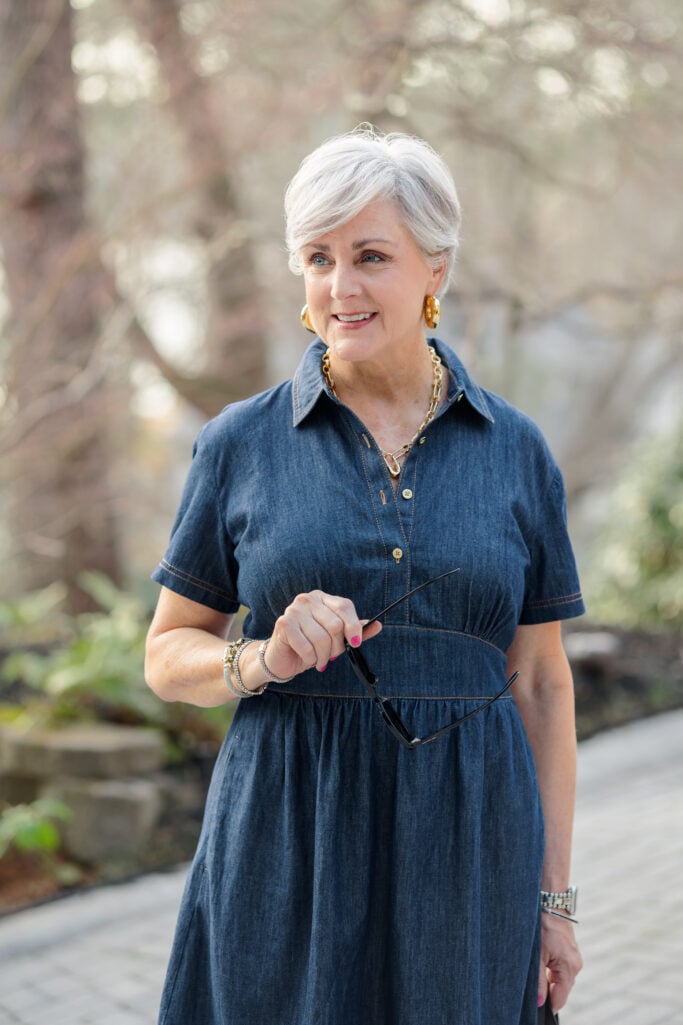 This is one of my favorite trends for women over 50 because a single piece of color jewelry can transform an otherwise neutral outfit. You don’t need to buy a new wardrobe — just update your neck.