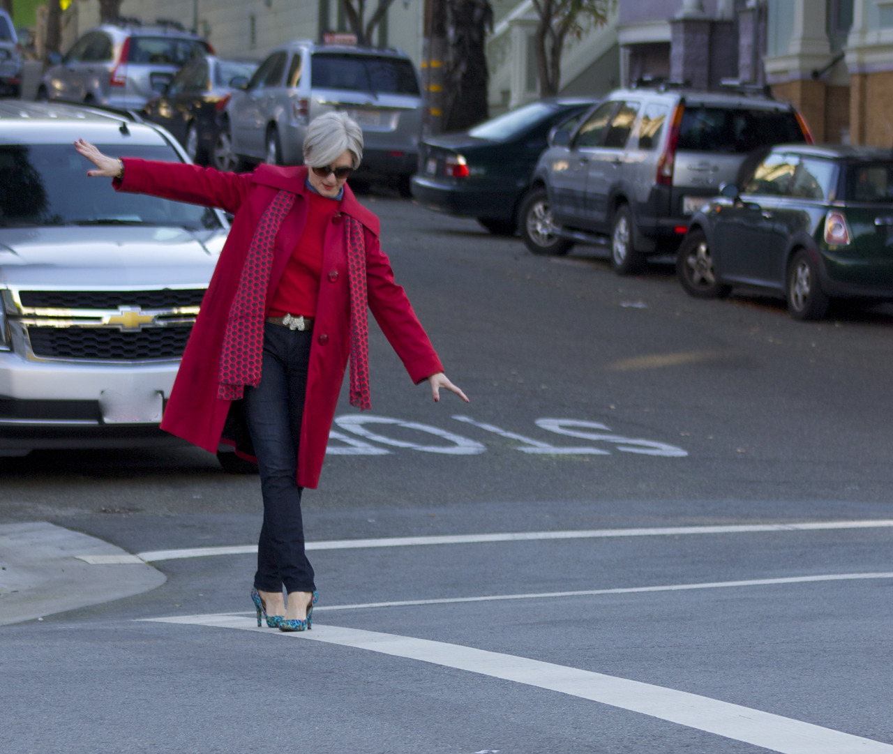 denim @AnnTaylor; coat @Coach; scarf @JCrew; shoes @NineWest; sunglasses @RayBan