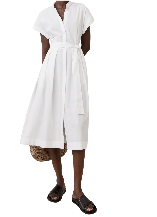 To me, the perfect summer dress is linen, white, and flows comfortably on my skin. Enter the Linen-Blend Midi Shirtdress from Banana Republic Factory. There are so many details to love about this dress. First, it’s a one-and-done outfit, perfect for all kinds of summer events and activities. The versatility of it being a button-up shirtdress means I can unbutton the bottom few buttons if I like.