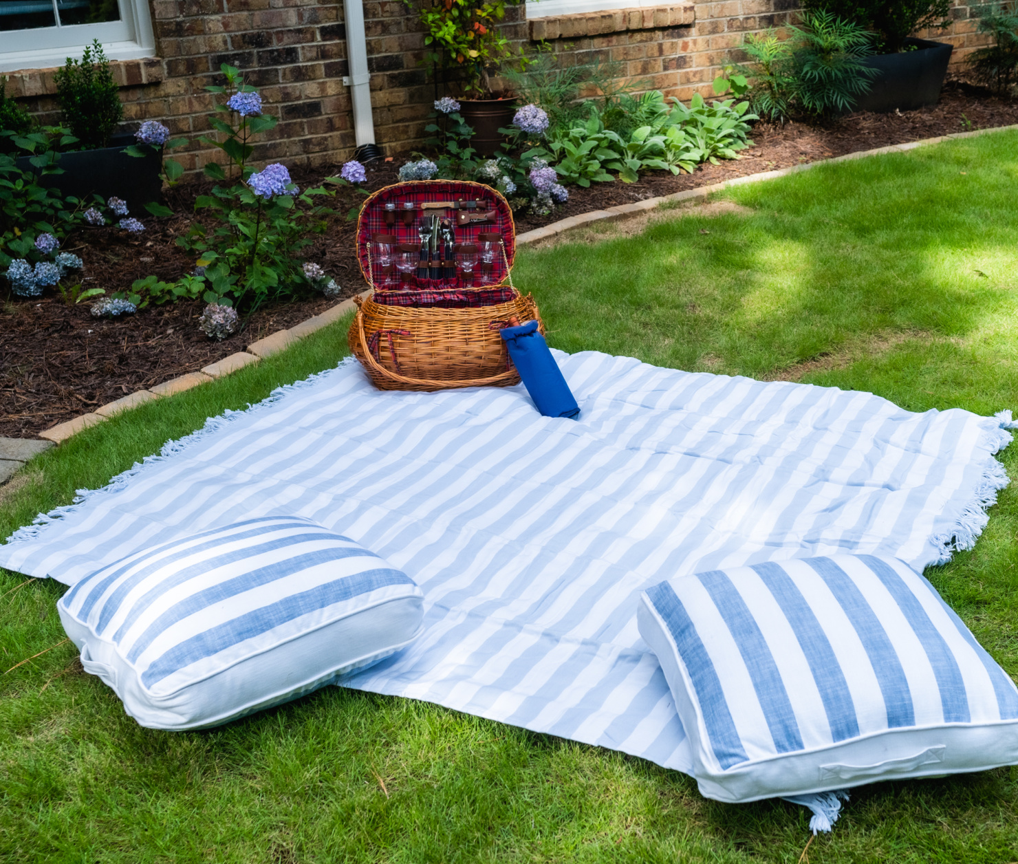 don’t forget a picnic blanket and pillows. a portable low table can be set up to make your dining experience a little easier. that’s on my wish list. or there are portable wine tables that anchor directly in the ground. picnicking has never been easier.